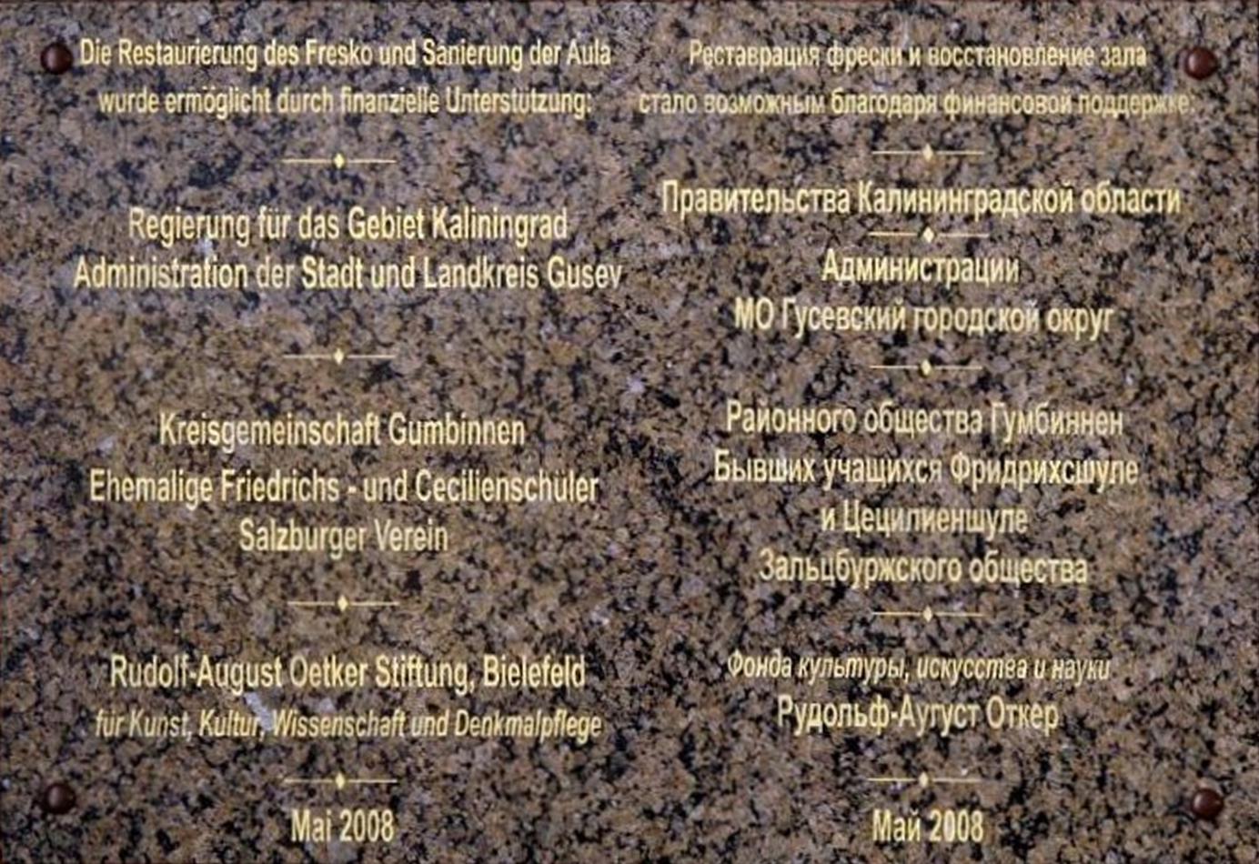 Friedrichschule in Gumbinnen, Ostpreußen; heute Guesev, Russische Föderation; Tafel mit den Spendern für die Restaurierung von 2008 | ||