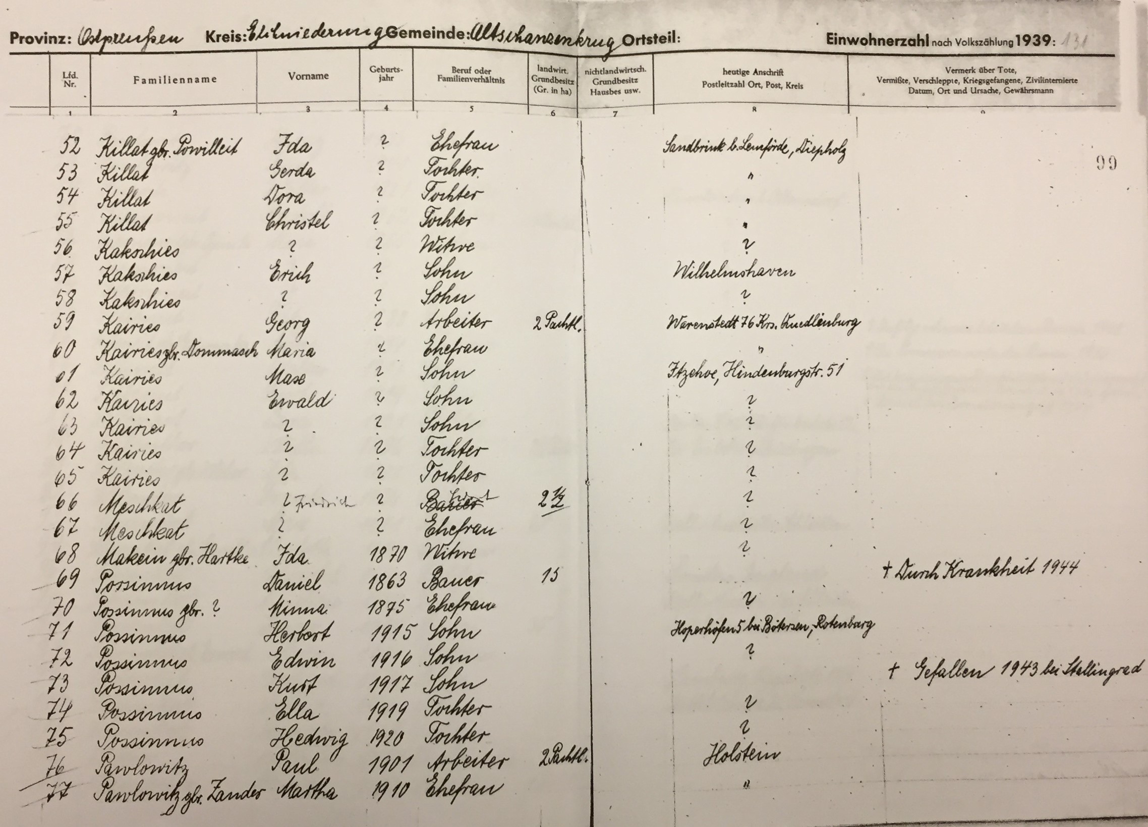 Baltruschkehmen: Einwohnerliste zum Zeitpunkt der Räumung Okt. 1944 |