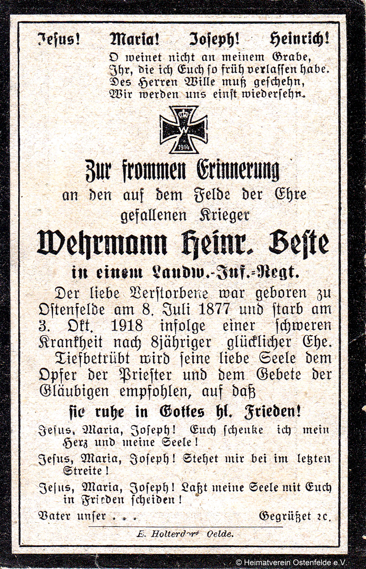 Totenzettel von Heinrich Beste aus Ostenfelde | ||||