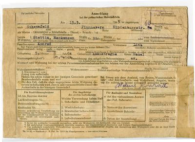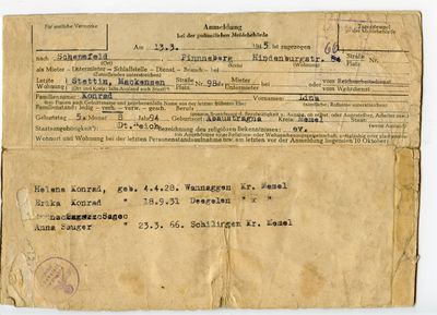 Nach der Meldebescheinigung muss Erika Konrad in Stettin geboren und getauft sein. Ihre Mutter Emma war vom 28.12.1942 bis 28.08.1943 bei Maria in Stettin gemeldet.