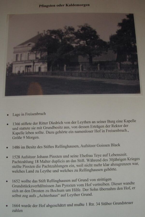 - 1366 stiftet der Ritter Diedrich von der Leythen an seiner Burg eine Kapelle und stattete sie mit Grundbesitz aus, von dessen Erträgen der Rektor der Kapelle leben sollte. Dazu gehörte ein namenloser Hof in Freisenbruch, Größe 9 Morgen.