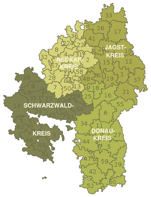 Aber auch diese Organisation hatte nur acht Jahre Bestand: 1818 wurden die Vogteien aufgelöst und durch vier Kreise ersetzt, die bis 1924 Bestand hatten. Der Zuschnitt der Oberämter, 1934 in Kreis umbenannt, blieb im Wesentlichen bis zu der Kreisreform 1938 bestehen. Im Folgenden wird die Verwaltungsorganisation von 1818 bis 1938 dargestellt, für die vorangehenden Reformen und die von 1938 wird auf den Artikel Verwaltungsgliederung Württembergs. In: Wikipedia, Die freie Enzyklopädie. verwiesen.