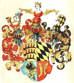 - In Blau eine rotgeschaftete, goldene Fahne mit schwarzem Adler (der Adler müsste den Kopf eigentlich zur Stange gewendet zeigen), des "Heiligen Römischen Reichs Sturmfahne", seit 1495 das Zeichen des Reichsbanneramtes.