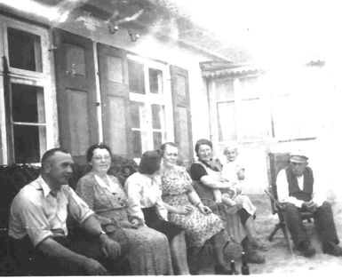 ![]() Otto Lorenz, Margarethe Neumann geb. Kahl [2], Maria Kahl geb. Holz, Ella Lorenz geb. Kahl, Anna Kahl, verw. Holz geb. Baß (4.Ehefrau von Albert Kahl), auf dem Schoß Margot Lemann geb. Kahl, Bauer Albert Kahl im Jahre 1944 |