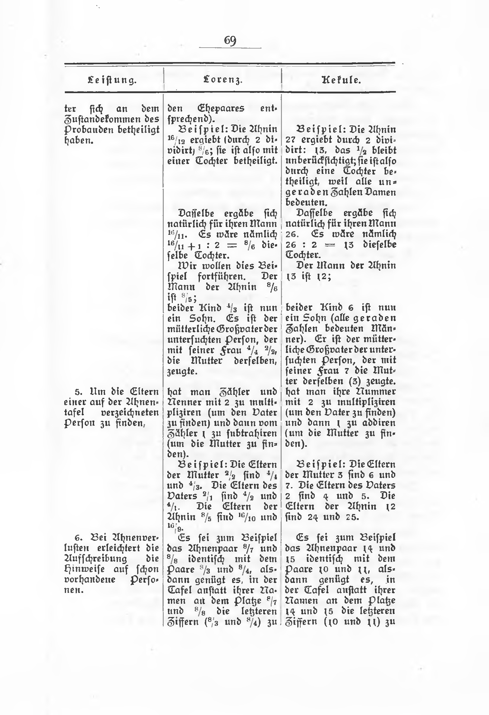 | 5. Um die Eltern einer auf der Ahnentafel verzeichneten Person zu finden, | hat man Zähler und Nenner mit 2 zu multipliziren (um den Vater zu finden) und dann vom Zähler 1 zu subtrahiren (um die Mutter zu finden). | hat man ihre Nummer mit 2 zu multipliziren (um den Vater zu finden) und dann 1 zu addiren (um die Mutter zu finden). |