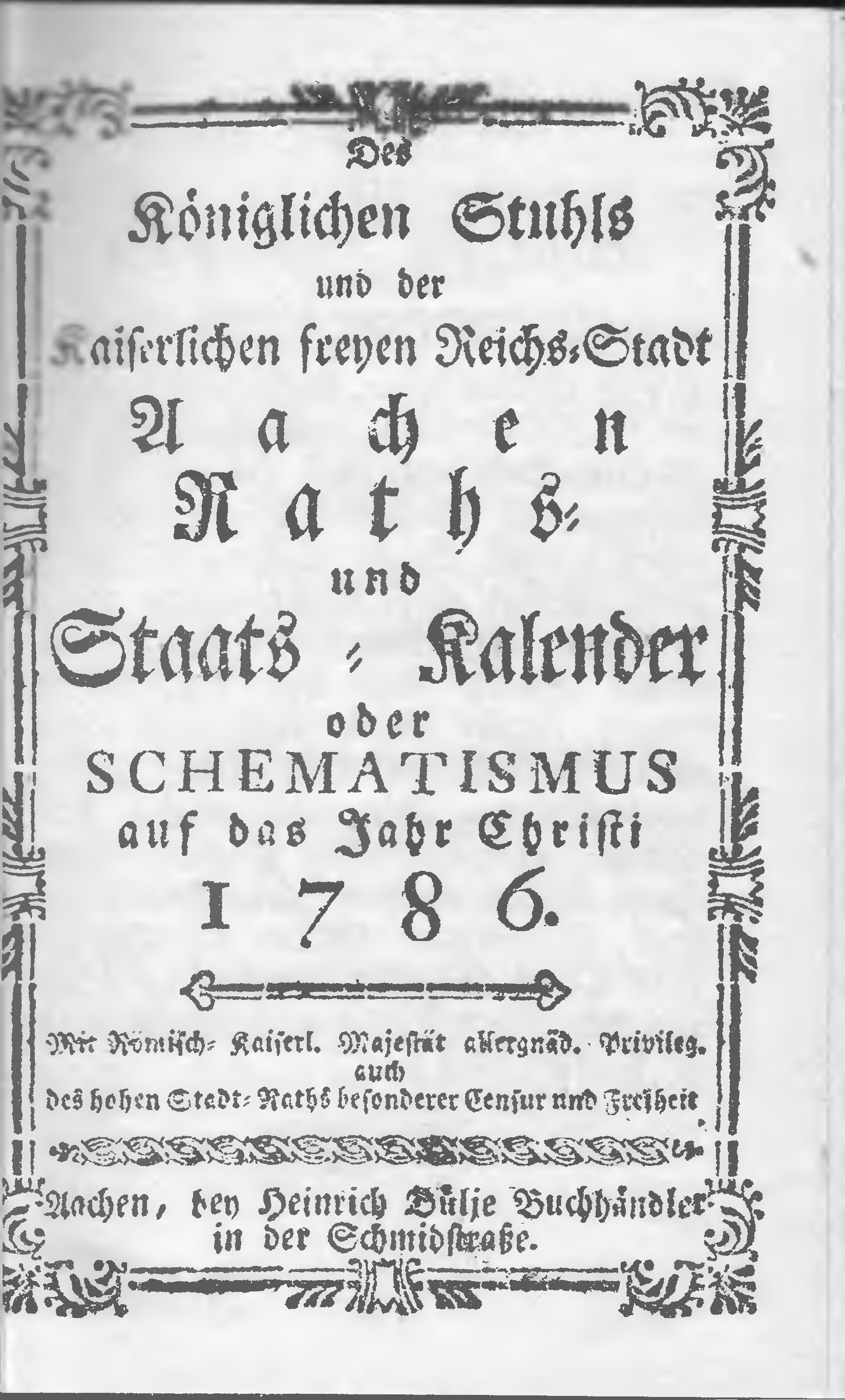 Des Königlichen Stuhls und der Kaiserlichen freyen Reichs-Stadt Aachen Raths- und Staatskalender oder Schematismus auf das Jahr Christi 1786, Aachen (1785)