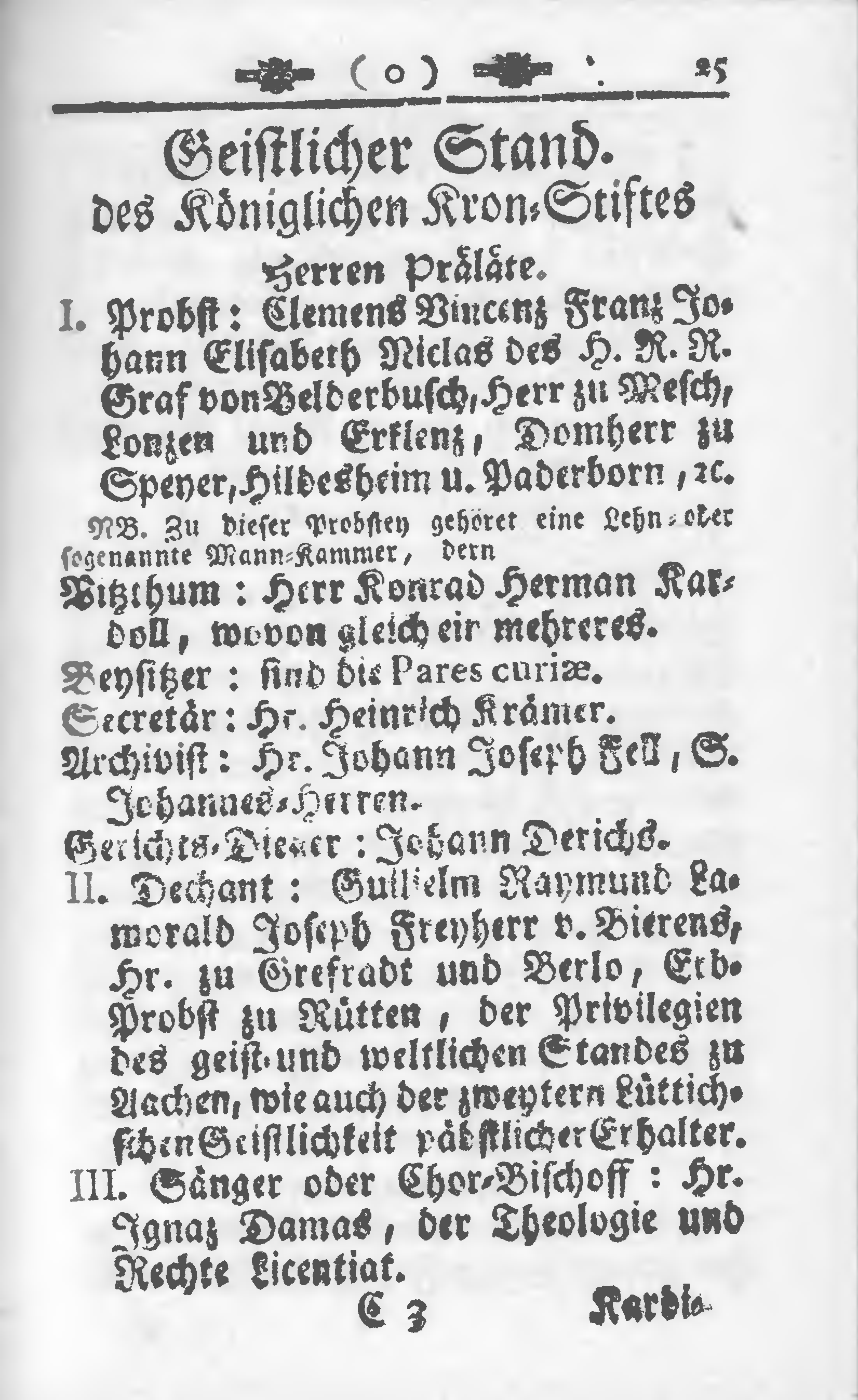 I. Probst: Clemens Vincenz Franz Johann Elisabeth Niclas des H. K. K. Graf von Belderbusch, Herr zu Mesch, Lonzen und Erklenz, Domherr zu Speyer, Hildeheim u. Paderborn, ec.