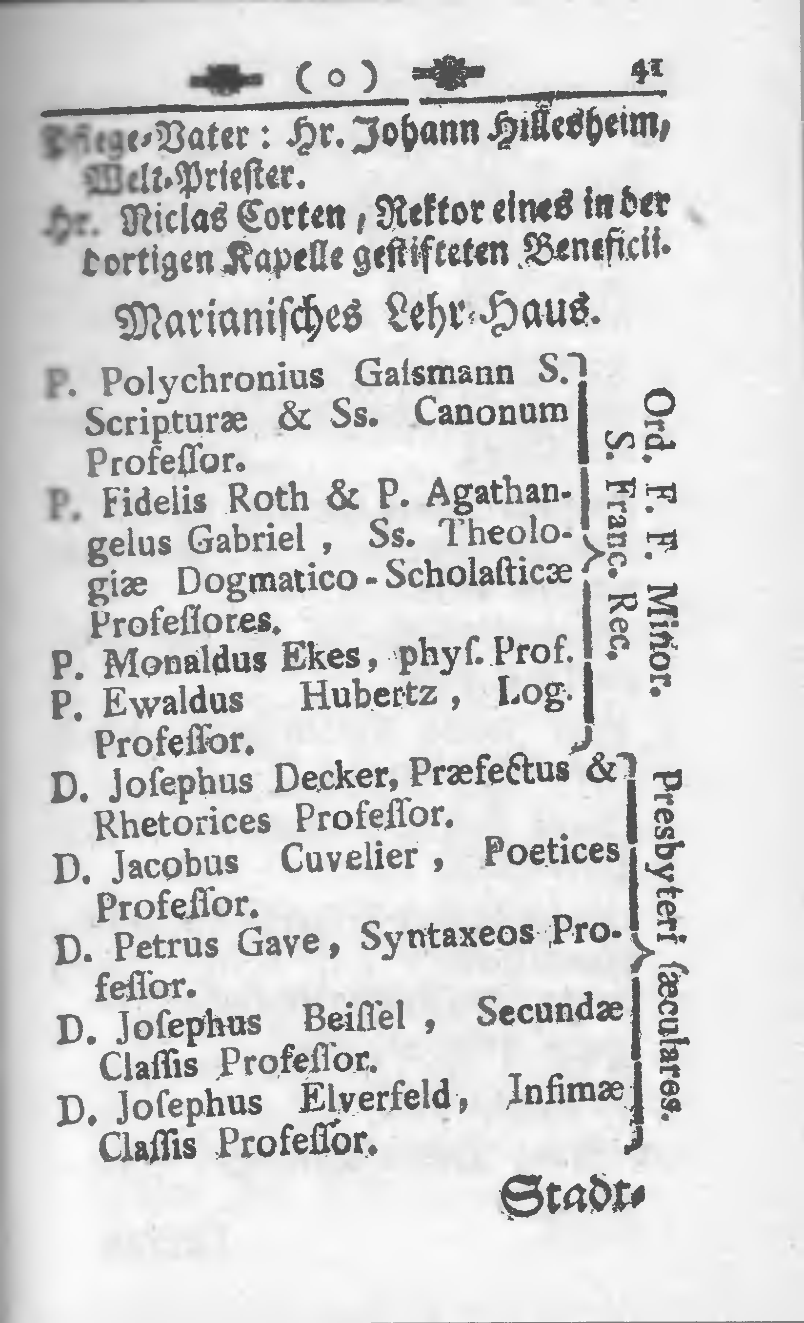 - D. Josephus Elverfeld, Infimae Classis Professor.