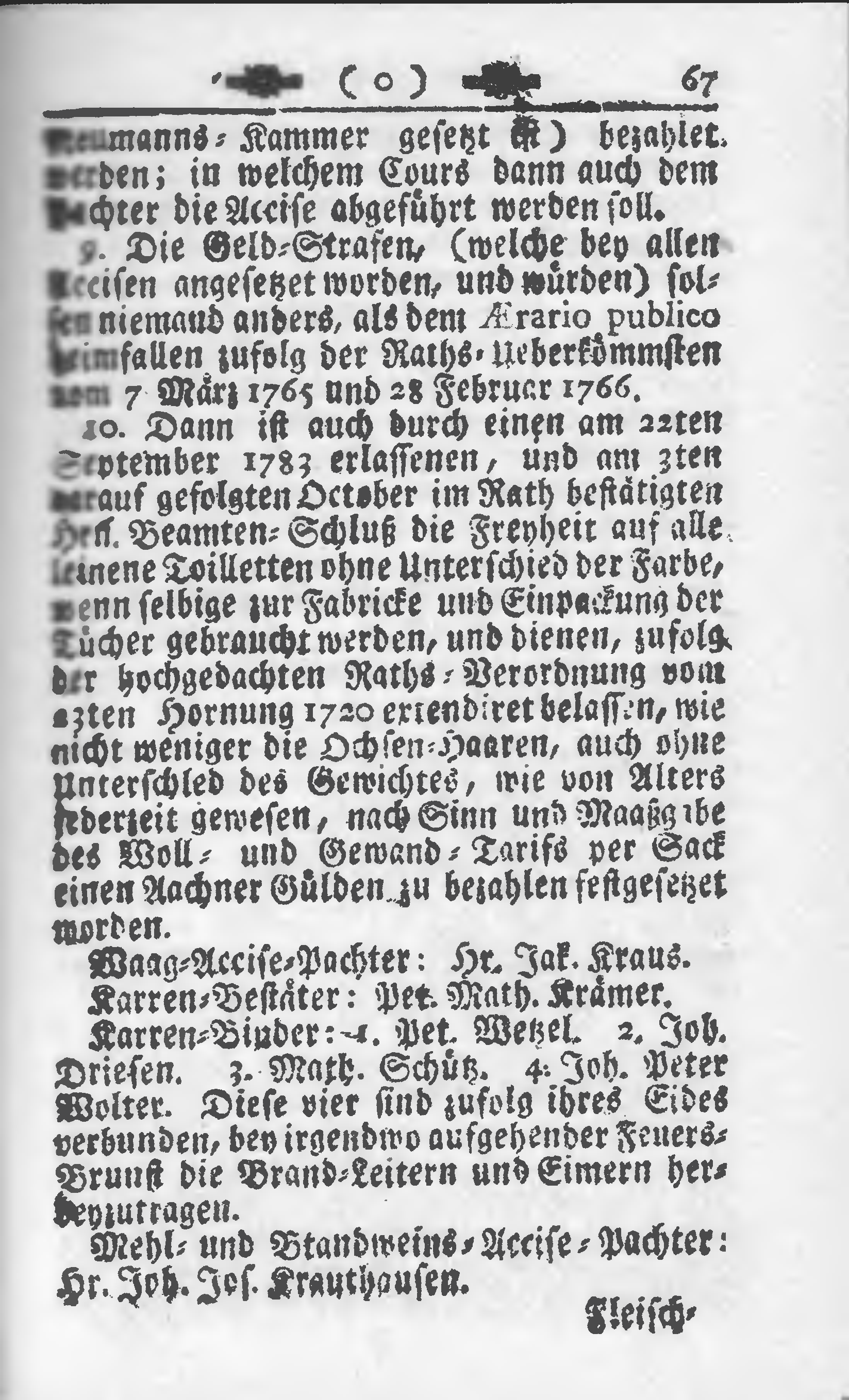 - Die Geld-Strafen, (welche bey allen Accisen angesetzet worden, und würden) sollen niemand anders, als dem Aerario publico heimfallen zufolg der Raths-Ueberkömmsten vom 7 März 1765 und 28 Februar 1766.