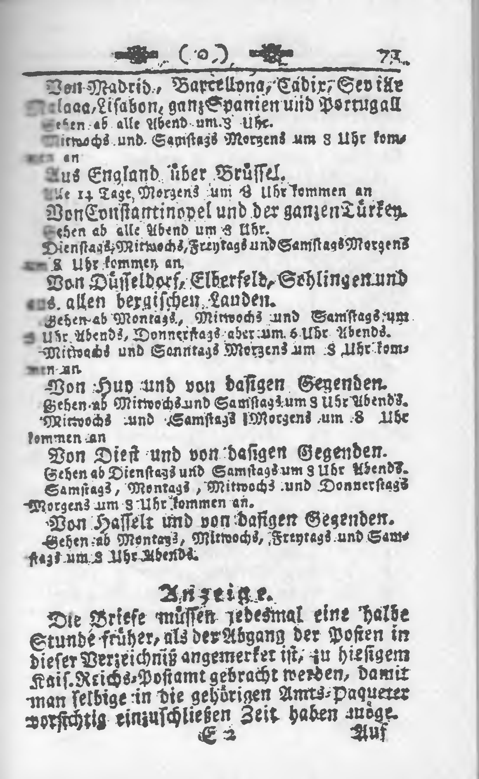 Die Briefe müssen jedesmal eine halbe Stunde früher, als der Abgang der Posten in dieser Verzeichnis angemerket ist, zu hiesigem Kais. Reichs-Postamt gebracht werden, damit man selbige in die gehörigen Amts-Paqueter vorsichtig einzuschließen Zeit haben möge.