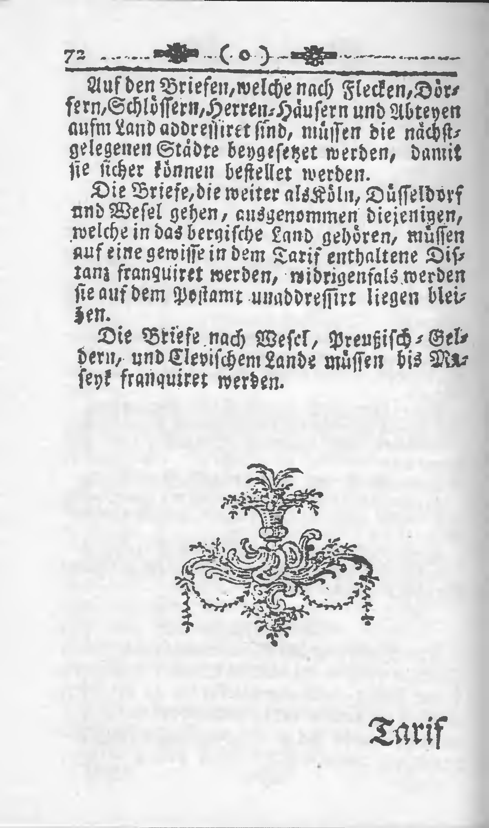 Die Briefe, die weiter als Köln, Düsseldorf und Wesel gehen, ausgenommen diejenigen, welche in das bergische Land gehören, müssen auf eine gewisse in dem Tarif enthaltene Distanz franquiret werden, widrigenfals werden sie auf dem Postamt unaddressirt liegen bleiben.