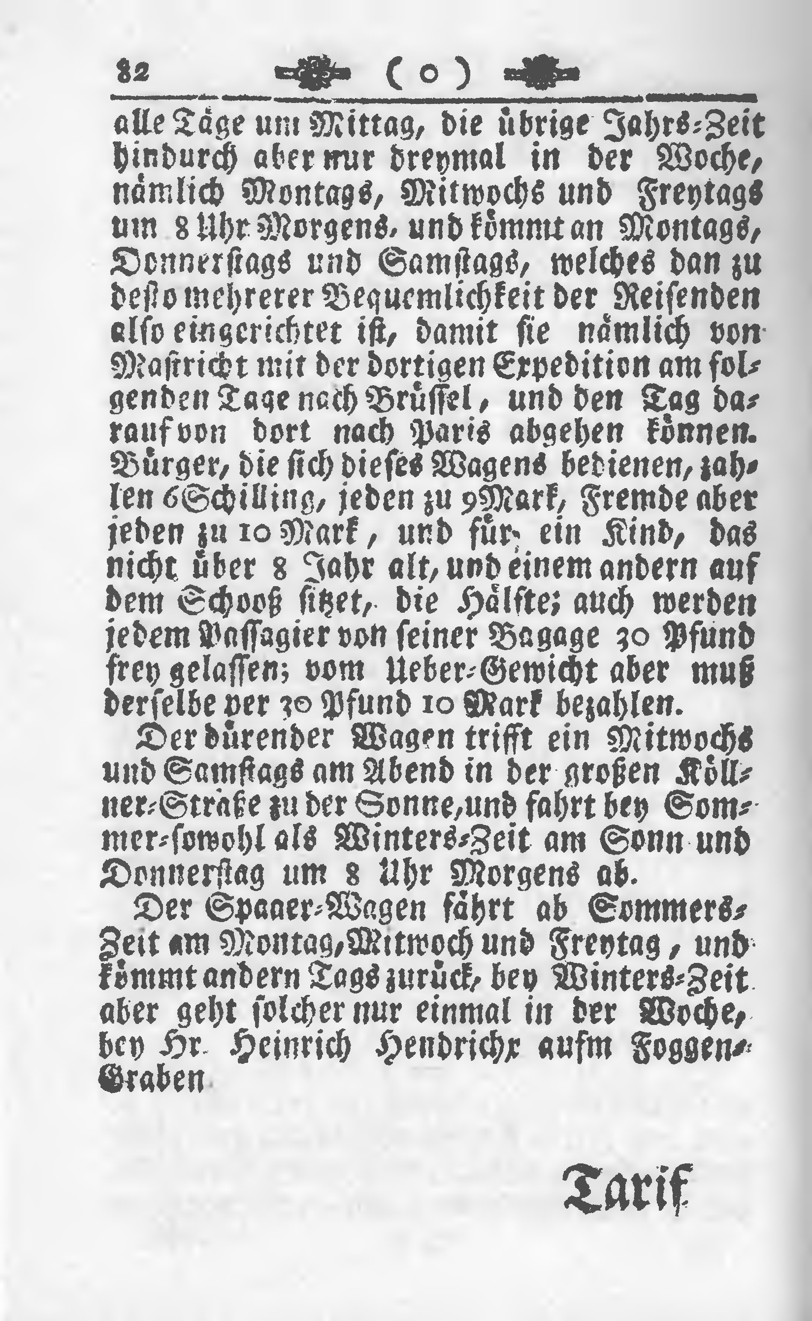 alle Täge um Mittag, die übrige Jahrs-Zeit hindurch aber nur dreymal in der Woche, nämlich Montags, Mitwochs und Freytags um 8 Uhr Morgens, und kömmt an Montags, Donnerstags und Samstags, welches dan zu desto mehrerer Bequemlichkeit der Reisenden also eingerichtet ist, damit sie nämlich von Mastricht mit der dortigen Expedition am folgenden Tage nach Brüssel, und den Tag darauf von dort nach Paris abgehen können. Bürger, die sich dieses Wagens bedienen, zahlen 6 Schilling, jeden zu 9 Mark, Fremde aber jeden zu 10 Mark, und für ein Kind, das nicht über 8 Jahr alt, und einem andern auf dem Schooß sitzet, die Hälfte; auch werden jedem Passagier von seiner Bagage 30 Pfund frey gelassen; vom Ueber-Gewicht aber muß derselbe per 30 Pfund 10 Mark bezahlen.