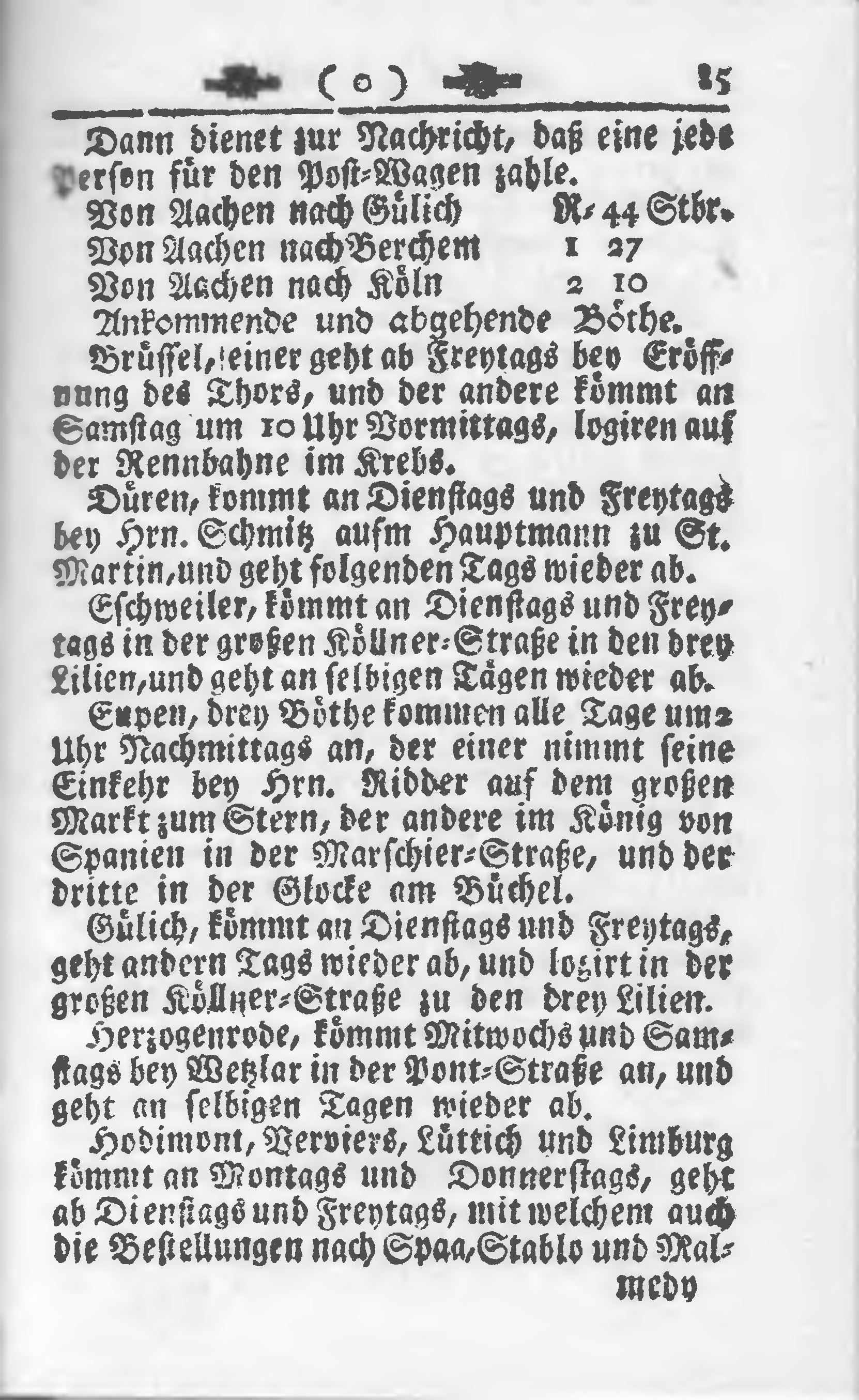 Düren, kommt an Dienstags und Freytags bey Hrn. Schmitz aufm Hauptmann zu St. Martin, und geht folgenden Tags wieder ab.