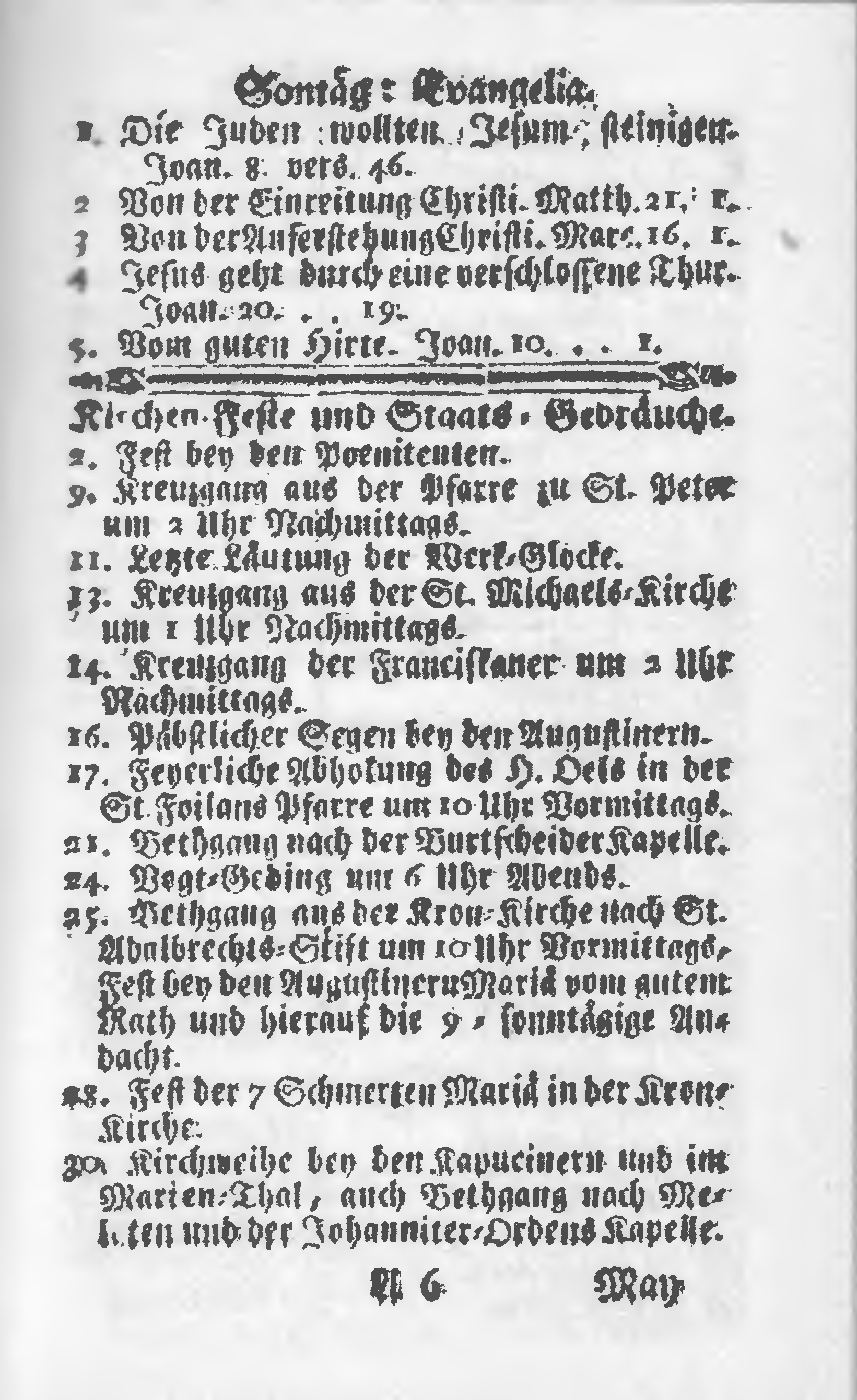 | 25. | Bethgang aus der Kron-Kirche nach St. Adalbrechts-Stift um 10 Uhr Vormittags, Fest bey den Augustinern Mariä vom gutem Rath und hierauf die 9-sonntägige Andacht. |