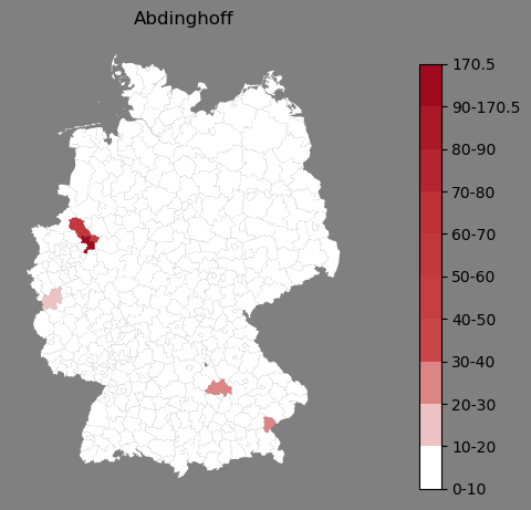 Absolute Verteilung des Namens Abdinghoff (1890)Direkt zur Karte Absolute Verteilung des Namens "Abdinghoff" um 1890 im damaligen Deutschen Reich Sie können die Karte innerhalb des Fensters zoomen und verschieben. |