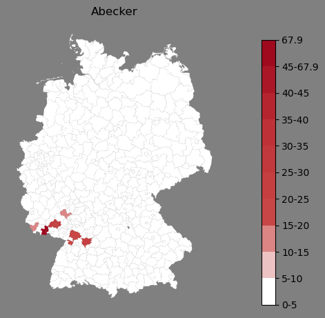 Relative Verteilung des Namens Abecker (1996)Direkt zur Karte Die Farbskala zeigt die Anzahl von "Abecker" bezogen auf je 1 Million Einträge. |