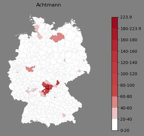Relative Verteilung des Namens Achtmann (1996)Direkt zur Karte Die Farbskala zeigt die Anzahl von "Achtmann" bezogen auf je 1 Million Einträge. |