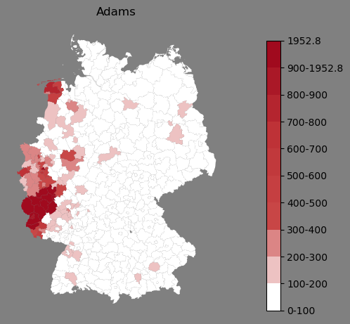 Absolute Verteilung des Namens Adams (1890)Direkt zur Karte Absolute Verteilung des Namens "Adams" um 1890 im damaligen Deutschen Reich Sie können die Karte innerhalb des Fensters zoomen und verschieben. |
