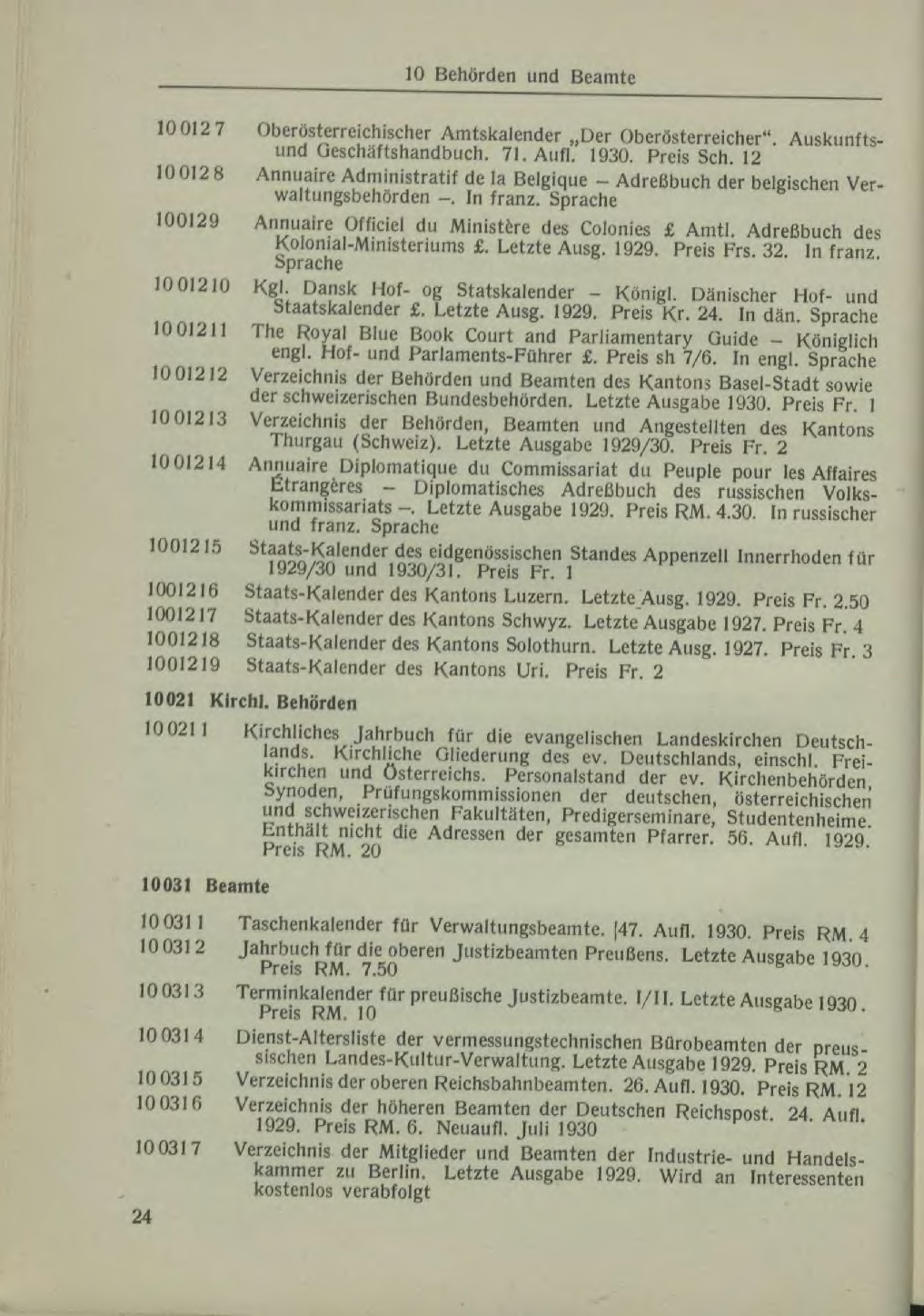 | 10 031 1 | Taschenkalender für Verwaltungsbeamte. |47. Aufl. 1930. Preis RM. 4 |
