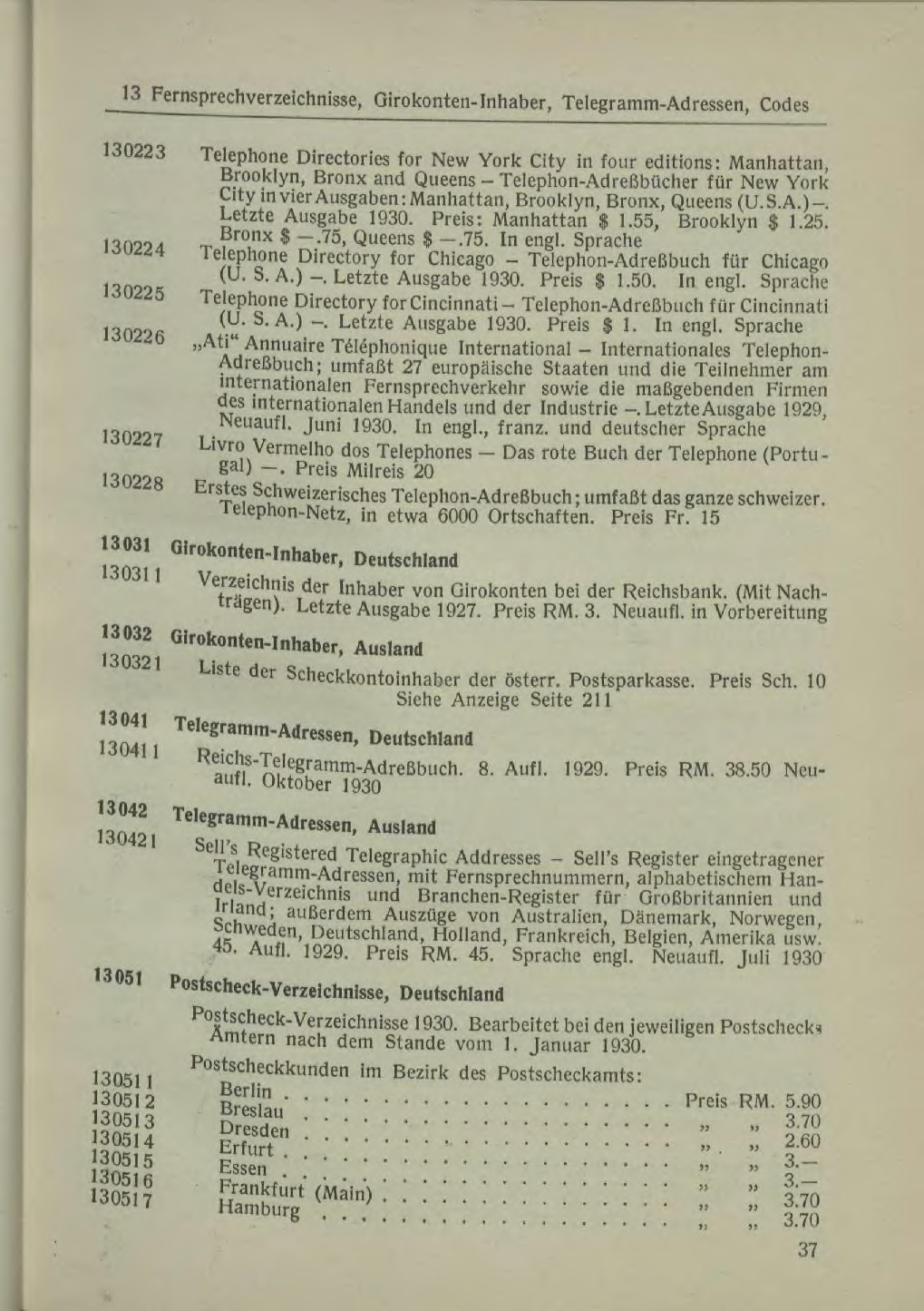 | 13 031 1 | Verzeichrtis der Inhaber von Girokonten bei der Reichsbank. (Mit Nachträgen). Letzte Ausgabe 1927. Preis RM. 3. Neuaufl. in Vorbereitung |