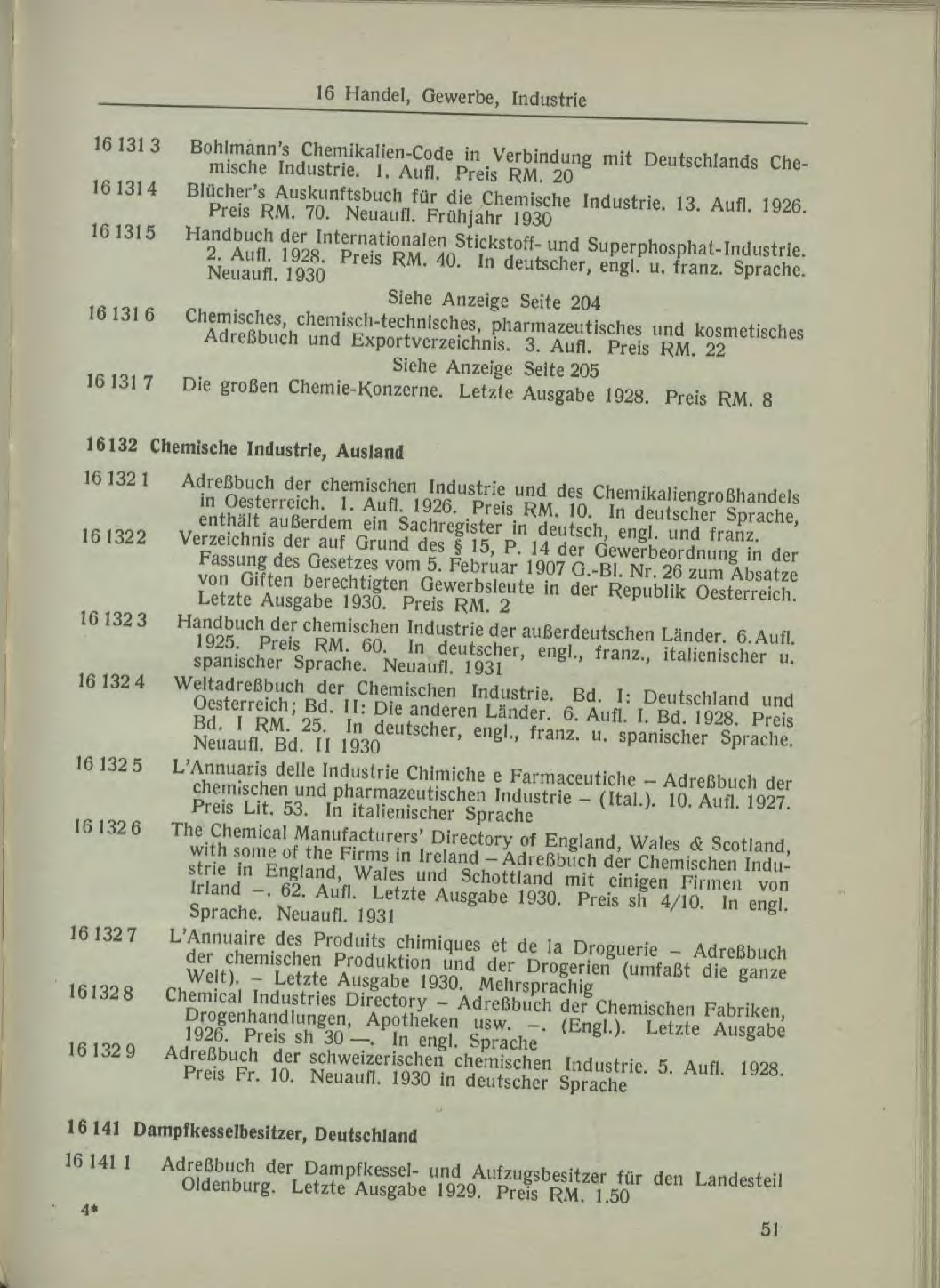| 16 132 3 | Handbuch der chemischen Industrie der außerdeutschen Länder. 6. Aufl. 1925. Preis RM. 60. In deutscher, engl., franz., italienischer u. spanischer Sprache. Neuaufl. 1931 |