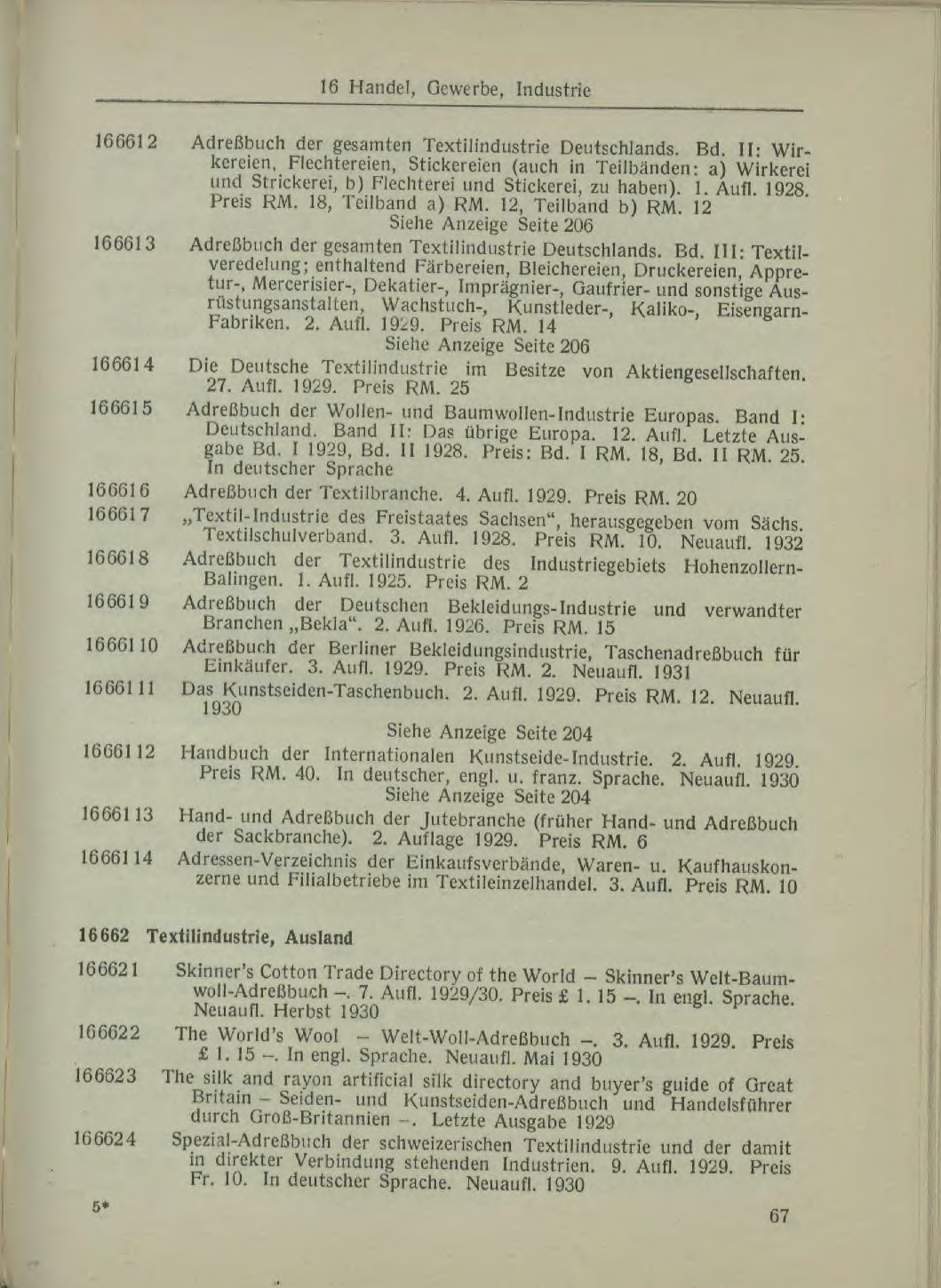 | 16 661 7 | „Textil-Industrie des Freistaates Sachsen", herausgegeben vom Sachs. Textilschulverband. 3. Aufl. 1928. Preis RM. 10. Neuaufl. 1932 |