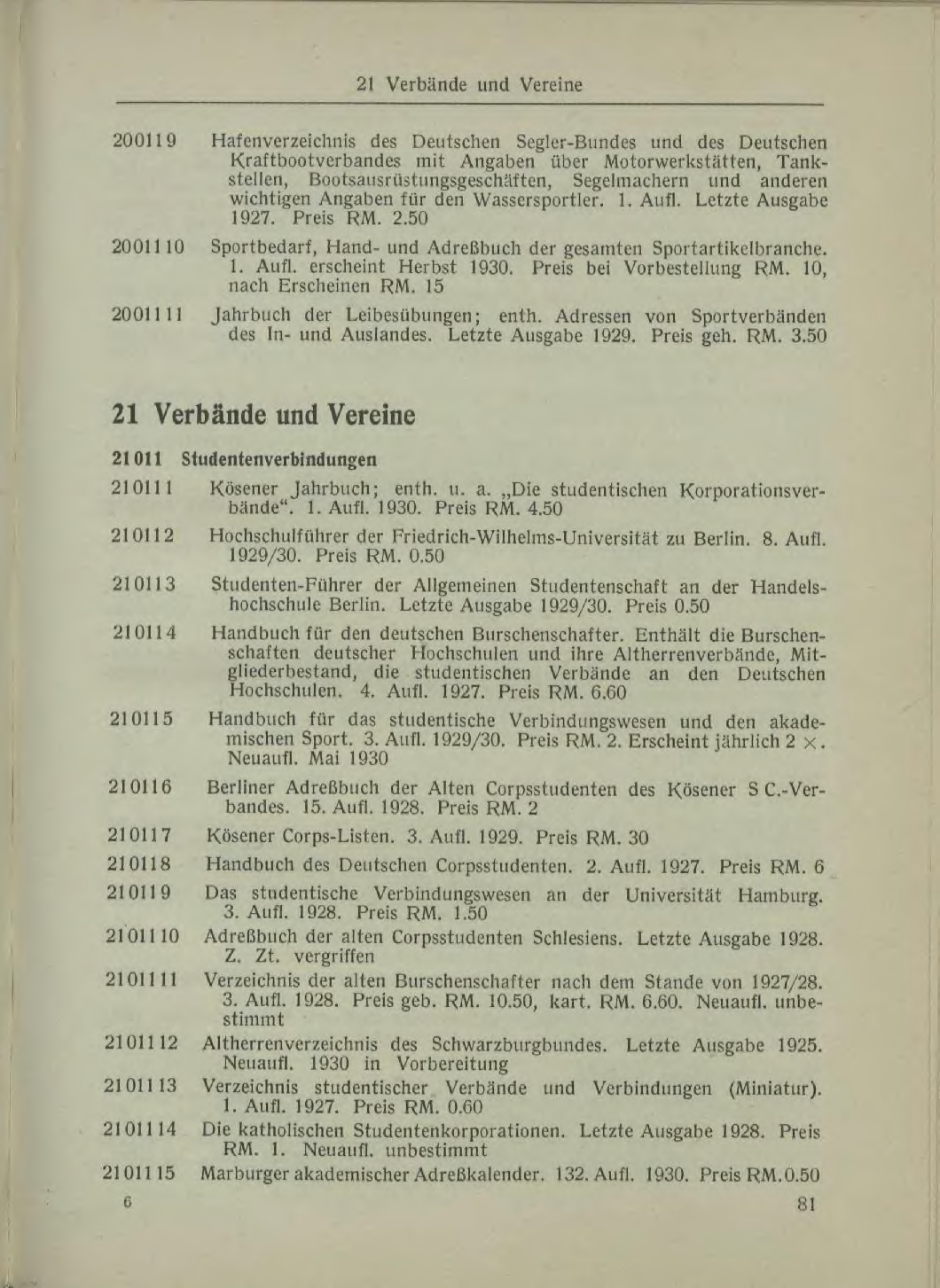 | 21 011 5 | Handbuch für das studentische Verbindungswesen und den akademischen Sport. 3. Aufl. 1929/30. Preis RM. 2. Erscheint jährlich 2 x . Neuaufl. Mai 1930 |