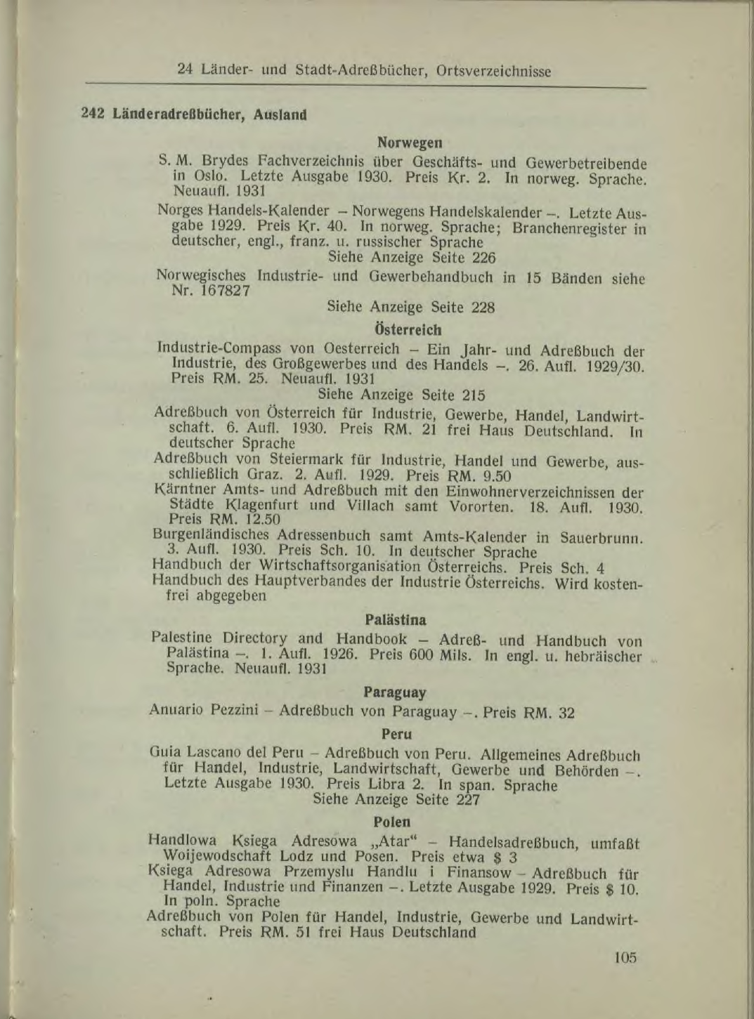 Norwegen S. M. Brydes Fachverzeichnis über Geschäfts- und Gewerbetreibende in Oslo. Letzte Ausgabe 1930. Preis Kr. 2. In norweg. Sprache. Neuaufl. 1931 Norges Handels-Kalender - Norwegens Handelskalender -. Letzte Ausgabe 1929. Preis Kr. 40. In norweg. Sprache; Branchenregister in deutscher, engl., franz. u. russischer Sprache Siehe Anzeige Seite 226 Norwegisches Industrie- und Gewerbehandbuch in 15 Bänden siehe Nr. 167827 Siehe Anzeige Seite 228 Österreich Industrie-Compass von Oesterreich - Ein Jahr- und Adreßbuch der Industrie, des Großgewerbes und des Handels -. 26. Aufl. 1929/30. Preis RM. 25. Neuaufl. 1931 Siehe Anzeige Seite 215 Adreßbuch von Österreich für Industrie, Gewerbe, Handel, Landwirtschaft. 6. Aufl. 1930. Preis RM. 21 frei Haus Deutschland. In deutscher Sprache Adreßbuch von Steiermark für Industrie, Handel und Gewerbe, ausschließlich Graz. 2. Aufl. 1929. Preis RM. 9.50 Kärntner Amts- und Adreßbuch mit den Einwohnerverzeichnissen der Städte Klagenfurt und Villach samt Vororten. 18. Aufl. 1930. Preis RM. 12.50 Burgenländisches Adressenbuch samt Amts-Kalender in Sauerbrunn. 3. Aufl. 1930. Preis Sch. 10. In deutscher Sprache Handbuch der Wirtschaftsorganisation Österreichs. Preis Svh. 4 Handbuch des Hauptverbandes der Industrie Österreichs. Wird kostenfrei abgegeben Palästina Palestine Directory and Handbook - Adreß- und Handbuch von Palästina -. 1. Aufl. 1926. Preis 600 Mils. In engl. u. hebräischer Sprache. Neuaufl. 1931 Paraguay Anuario Pezzini - Adreßbuch von Paraguay -. Preis RM. 32 Peru Guia Lascano del Peru - Adreßbuch von Peru. Allgemeines Adreßbuch für Handel, Industrie, Landwirtschaft, Gewerbe und Behörden -. Letzte Ausgabe 1930. Preis Libra 2. In span. Sprache Siehe Anzeige Seite 227 Polen Handiowa Ksiega Adresowa „Atar" - Handelsadreßbuch, umfaßt Woijewodschaft Lodz und Posen. Preis etwa $ 3 Ksiega Adresowa Przemyslu Handlu i Finansow - Adreßbuch für Handel, Industrie und Finanzen -. Letzte Ausgabe 1929. Preis $ 10. In poln. Sprache Adreßbuch von Polen für Handel, Industrie, Gewerbe und Landwirtschaft. Preis RM. 51 frei Haus Deutschland | |