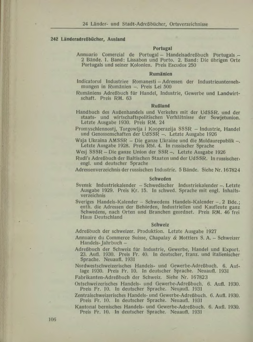 Portugal Annuario Comercial de Portugal - Handelsadreßbuch Portugals .-2 Bände. 1. Band: Lissabon und Porto. 2. Band: Die übrigen Orte Portugals und seiner Kolonien. Preis Escudos 250 Rumänien Indicatorul Industriee Romanesti-Adressen der Industrieunterneh-mtingen in Rumänien -. Preis Lei 500 Rumäniens Adreßbuch für Handel, Industrie, Gewerbe und Landwirtschaft. Preis RM. 63 Rußland Handbuch des Außenhandels und Verkehrs mit der UdSSR, und der Staats- und wirtschaftspolitischen Verhältnisse der Sowjetunion. Letzte Ausgabe 1930. Preis RM. 24 Promyschlennostj, Torgowlja i Kooperazija SSSR - Industrie, Handel und Genossenschaften der UdSSR -. Letzte Ausgabe 1926 Wsja Ukraina AMSSR - Die ganze Ukraine und die Moldaurepublik -. Letzte Ausgabe 1928. Preis Rbl. 4. In russischer Sprache Wesj SSSR - Die ganze Union der SSR -. Letzte Ausgabe 1926 Rudls Adreßbuch der Baltischen Staaten und der UdSSR. In russischer, engl. und deutscher Sprache Adressenverzeichnis der russischen Industrie. 5 Bände. Siehe Nr. 167824 Schweden Svensk Industriekalender - Schwedischer Industriekalender -. Letzte Ausgabe 1929. Preis Kr. 15. In schwed. Sprache mit engl. Inhaltsverzeichnis Sveriges Handels-Kalender •- Schwedens Handels-Kalender-. 2 Bde.; enth. die Adressen der Behörden, Industriellen und Kaufleute ganz Schwedens, nach Orten und Branchen geordnet. Preis RM. 46 frei Haus Deutschland Schweiz Adreßbuch der schweizer. Produktion. Letzte Ausgabe 1927 Annuaire du Commerce Suisse, Chapalay & Mottiers S. A. - Schweizer Handels-Jahrbuch — Adreßbuch der Schweiz für Industrie, Gewerbe, Handel und Export. 23. Aufl. 1930. Preis Fr. 40. In deutscher, franz. und italienischer Sprache. Neuaufl. 1931 Nordwestschweizerisches Handels- und Gewerbe-Adreßbuch. 6. Auflage 1930. Preis Fr. 10. In deutscher Sprache. Neuaufl. 1931 Fabrikanten-Adreßbuch der Schweiz. Siehe Nr. 167823 Ostschweizerisches Handels- und Gewerbe-Adreßbuch. 6. Aufl. 1930. Preis Fr. 10. In deutscher Sprache. Neuaufl. 1931 Zentralschweizerisches Handels-und Gewerbe-Adreßbuch. 6. Aufl. 1930. Preis Fr. 10. In deutscher Sprache. Neuaufl. 1931 Kantonal bernisches Handels- und Gewerbe-Adreßbuch. 6. Aufl. 1930. Preis Fr. 10. In deutscher Sprache. Neuaufl. 1931 | |