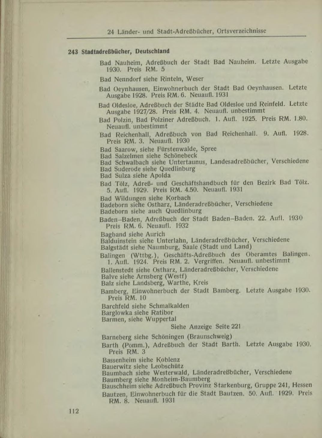 Bad Nenndorf siehe Rinteln, Weser Bad Oeynhausen, Einwohnerbuch der Stadt Bad Oeynhausen. Letzte Ausgabe 1928. Preis RM. 6. Neuaufl. 1931 Bad Oldesloe, Adreßbuch der Städte Bad Oldesloe und Reinfeld. Letzte Ausgabe 1927/28. Preis RM. 4. Neuaufl. unbestimmt Bad Polzin, Bad Polziner Adreßbuch. 1. Aufl. 1925. Preis RM. 1.80. Neuaufl. unbestimmt Bad Reichenhall, Adreßbuch von Bad Reichenhall. 9. Aufl. 1928. Preis RM. 3. Neuaufl. 1930 Bad Saarow, siehe Fürstenwalde, Spree Bad Salzelmen siehe Schönebeck Bad Schwalbach siehe Untertaunus, Landesadreßbücher, Verschiedene Bad Suderode siehe Quedlinburg Bad Sulza siehe Apolda Bad Tölz, Adreß- und Geschäftshandbuch für den Bezirk Bad Tölz. 5. Aufl. 1929. Preis RM. 4.50. Neuaufl. 1931 Bad Wildlungen siehe Korbach Badeborn siehe Ostharz, Länderadreßbücher, Verschiedene Badeborn siehe auch Quedlinburg Baden-Baden, Adreßbuch der Stadt Baden-Baden. 22. Aufl. 1930 Preis RM. 6. Neuaufl. 1932 Bagband siehe Aurich Balduinstein siehe Unterlahn, Länderadreßbücher, Verschiedene Balgstädt siehe Naumburg, Saale (Stadt und Land) Balingen (Wttbg.), Geschäfts-Adreßbuch des Oberamtes Balingen. 1. Aufl. 1924. Preis RM. 2. Vergriffen. Neuaufl. unbestimmt Ballenstedt siehe Ostharz, Länderadreßbücher, Verschiedene Balve siehe Arnsberg (Westf) Balz siehe Landsberg, Warthe, Kreis Bamberg, Einwohnerbuch der Stadt Bamberg. Letzte Ausgabe 1930. Preis RM. 10 Barchfeld siehe Schmalkalden Barglowka siehe Ratibor Barmen, siehe Wuppertal Siehe Anzeige Seite 221 Barneberg siehe Schöningen (Braunschweig) Barth (Pomm.), Adreßbuch der Stadt Barth. Letzte Ausgabe 1930. Preis RM. 3 Bassenheim siehe Koblenz Bauerwitz siehe Leobschütz Baumbach siehe Westerwald, Länderadreßbücher, Verschiedene Baumberg siehe Monheim-Baumberg Bauschheim siehe Adreßbuch Provinz Starkenburg, Gruppe 241, Hessen Bautzen, Einwohnerbuch für die Stadt Bautzen. 50. Aufl. 1929. Preis RM. 8. Neuaufl. 1931 | |
