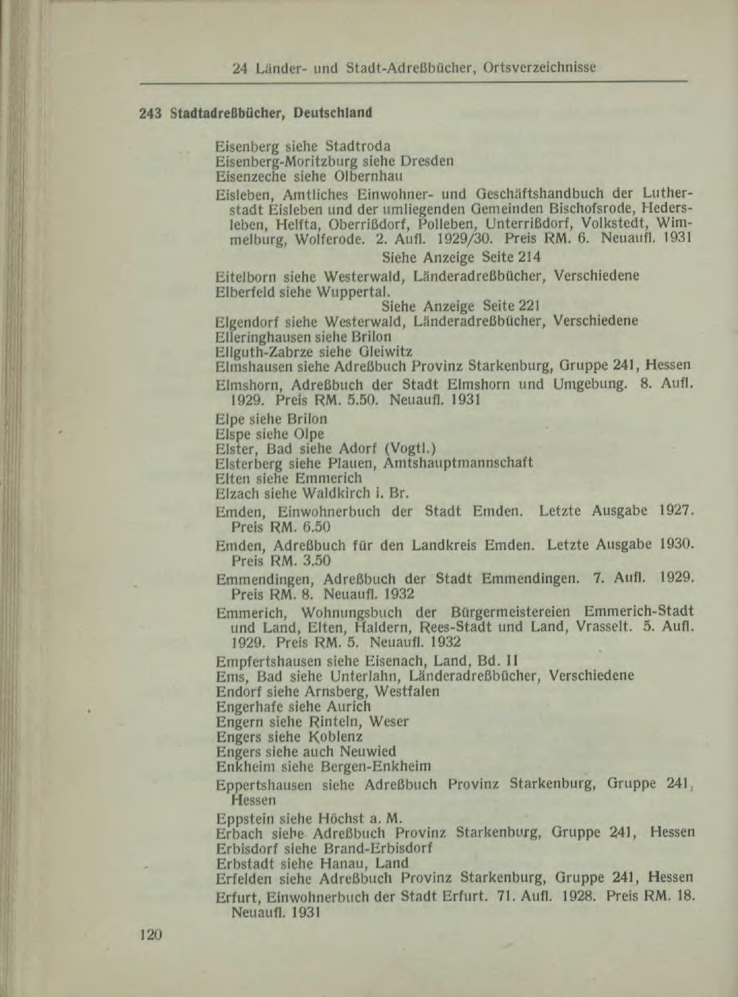 Eisenberg-Moritzburg siehe Dresden Eisenzeche siehe Olbernhau Eisleben, Amtliches Einwohner- und Geschäftshandbuch der Lutherstadt Eisleben und der umliegenden Gemeinden Bischofsrode, Hedersleben, Helfta, Oberrißdorf, Polleben, Unterrißdorf, Volkstedt, Wimmelburg, Wolferode. 2. Aufl. 1929/30. Preis RM. 6. Neuaufl. 1931 Siehe Anzeige Seite 214 Eitelborn siehe Westerwald, Länderadreßbücher, Verschiedene Elberfeld siehe Wuppertal. Siehe Anzeige Seite 221 Elgendorf siehe Westerwald, Länderadreßbücher, Verschiedene Elleringhausen siehe Brilon Ellguth-Zabrze siehe Gleiwitz Elmshausen siehe Adreßbuch Provinz Starkenburg, Gruppe 241, Hessen Elmshorn, Adreßbuch der Stadt Elmshorn und Umgebung. 8. Aufl. 1929. Preis RM. 5.50. Neuaufl. 1931 Elpe siehe Brilon Elspe siehe Olpe Elster, Bad siehe Adorf (Vogtl.) Elsterberg siehe Plauen, Amtshauptmannschaft Elten siehe Emmerich Elzach siehe Waldkirch i. Br. Emden, Einwohnerbuch der Stadt Emden. Letzte Ausgabe 1927. Preis RM. 6.50 Emden, Adreßbuch für den Landkreis Emden. Letzte Ausgabe 1930. Preis RM. 3.50 Emmendingen, Adreßbuch der Stadt Emmendingen. 7. Aufl. 1929. Preis RM. 8. Neuaufl. 1932 Emmerich, Wohnungsbuch der Bürgermeistereien Emmerich-Stadt und Land, Elten, Haldern, Rees-Stadt und Land, Vrasselt. 5. Aufl. 1929. Preis RM. 5. Neuaufl. 1932 Empfertshausen siehe Eisenach, Land, Bd. II Ems, Bad siehe Unterlahn, Länderadreßbücher, Verschiedene Endorf siehe Arnsberg, Westfalen Engerhafe siehe Aurich Engern siehe Rinteln, Weser Engers siehe Koblenz Engers siehe auch Neuwied Enkheim siehe Bergen-Enkheim Eppertshausen siehe Adreßbuch Provinz Starkenburg, Gruppe 241, Hessen Eppstein siehe Höchst a. M. Erbach siehe Adreßbuch Provinz Starkenburg, Gruppe 241, Hessen Erbisdorf siehe Brand-Erbisdorf Erbstadt siehe Hanau, Land Erfelden siehe Adreßbuch Provinz Starkenburg, Gruppe 241, Hessen Erfurt, Einwohnerbuch der Stadt Erfurt. 71. Aufl. 1928. Preis RM. 18. Neuaufl. 1931 | |