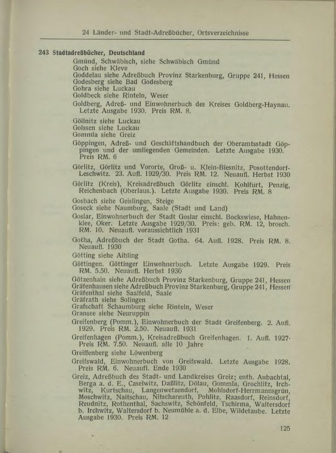 Goslar, Einwohnerbuch der Stadt Goslar einschl. Bockswiese, Hahnenklee, Oker. Letzte Ausgabe 1929/30. Preis: geb. RM. 12, brosch. RM. 10. Neuaufl. voraussichtlich 1931