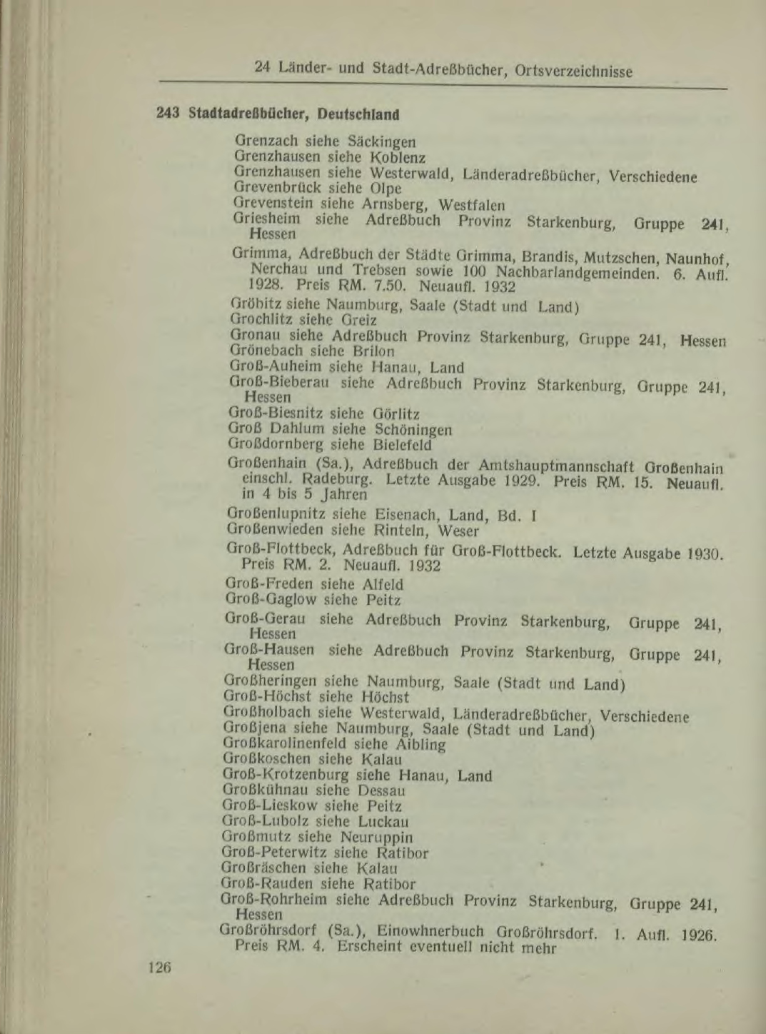 Grenzhausen siehe Koblenz Grenzhausen siehe Westerwald, Länderadreßbiicher, Verschiedene Grevenbrück siehe Olpe Orevenstein siehe Arnsberg, Westfalen Griesheim siehe Adreßbuch Provinz Starkenburg, Gruppe 241, Hessen Grimma, Adreßbuch der Städte Grimma, Brandis, Mutzschen, Naunhof, Nerchau und Trebsen sowie 100 Nachbarlandgemeinden. 6. Aufl. 1928. Preis RM. 7.50. Neuaufl. 1932 Grübitz siehe Naumburg, Saale (Stadt und Land) Grochlitz siehe Greiz Gronau siehe Adreßbuch Provinz Starkenburg, Gruppe 241, Hessen Grönebach siehe Brilon Groß-Auheim siehe Hanau, Land Groß-Bieberau siehe Adreßbuch Provinz Starkenburg, Gruppe 241, Hessen Groß-Biesnitz siehe Görlitz Groß Dahlum siehe Schöningen Großdornberg siehe Bielefeld Großenhain (Sa.), Adreßbuch der Amtshauptmannschaft Großenhain einschl. Radeburg. Letzte Ausgabe 1929. Preis RM. 15. Neuaufl. in 4 bis 5 Jahren Großenlupnitz siehe Eisenach, Land, Bd. I Großenwieden siehe Rinteln, Weser Groß-Flottbeck, Adreßbuch für Groß-Flottbeck. Letzte Ausgabe 1930. Preis RM. 2. Neuaufl. 1932 Groß-Freden siehe Alfeld Groß-Gaglow siehe Peitz Groß-Gerau siehe Adreßbuch Provinz Starkenburg, Gruppe 241, Hessen Groß-Hausen siehe Adreßbuch Provinz Starkenburg, Gruppe 241, Hessen Großheringen siehe Naumburg, Saale (Stadt und Land) Groß-Höchst siehe Höchst Großholbach siehe Westerwald, Landeradreßbücher, Verschiedene Großjena siehe Naumburg, Saale (Stadt und Land) Großkarolinenfeld siehe Aibling Großkoschen siehe Kalau Groß-Krotzenburg siehe Hanau, Land Großkühnau siehe Dessau Groß-Lieskow siehe Peitz Groß-Lubolz siehe Luckau Großmutz siehe Neuruppin Groß-Peterwitz siehe Ratibor Großräschen siehe Kalau Groß-Rauden siehe Ratibor Groß-Rohrheim siehe Adreßbuch Provinz Starkenburg, Gruppe 241, Hessen Großröhrsdorf (Sa.), Einowhnerbuch Großröhrsdorf. 1. Aufl. 1926. Preis RM. 4. Erscheint eventuell nicht mehr | |