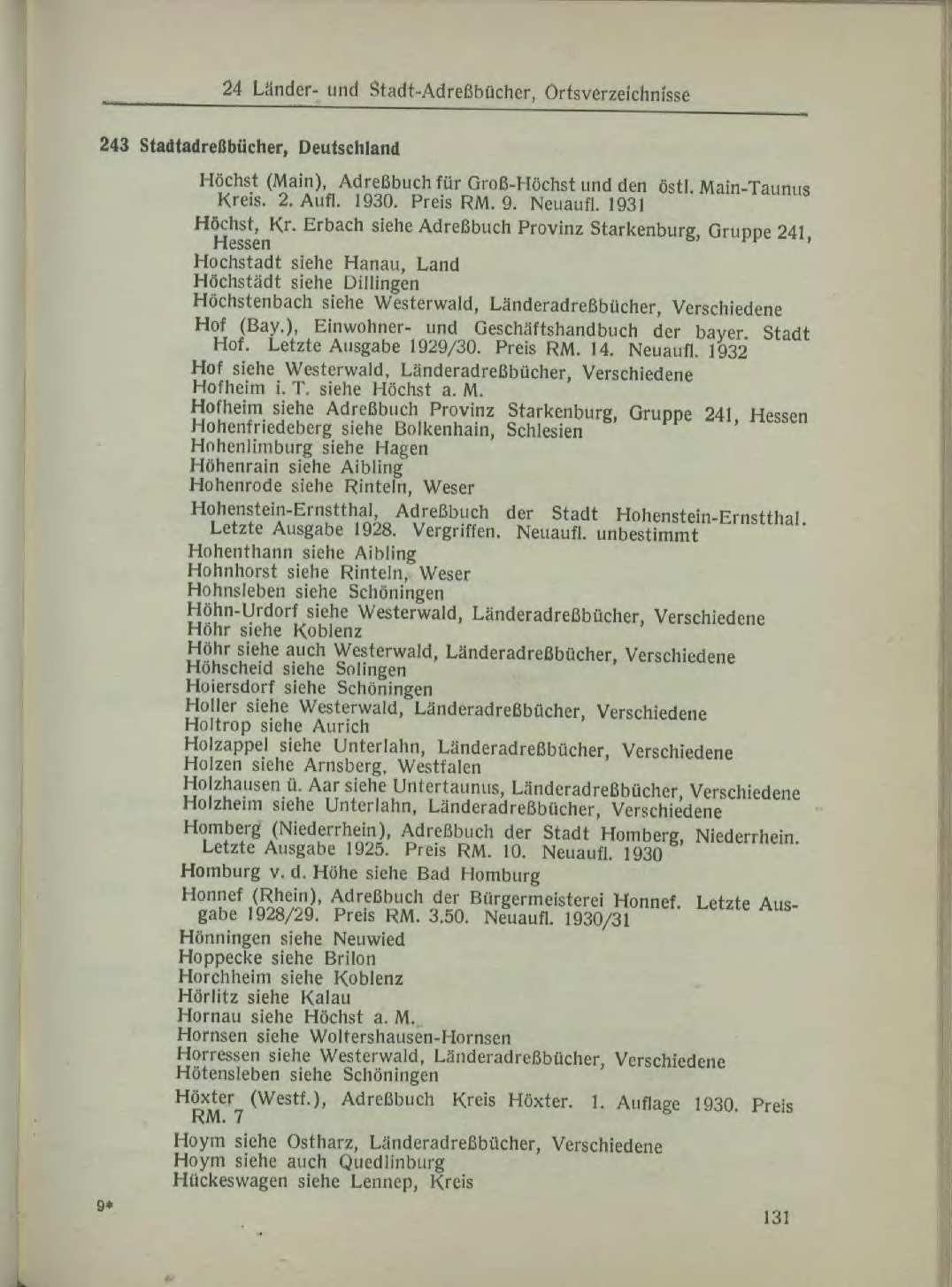 Höchst, Kr. Erbach siehe Adreßbuch Provinz Starkenburg, Gruppe 241, Hessen Hochstadt siehe Hanau, Land Höchstädt siehe Dillingen Höchstenbach siehe Westerwald, Länderadreßbücher, Verschiedene Hof (Bay.), Einwohner- und Geschäftshandbuch der bayer. Stadt Hof. Letzte Ausgabe 1929/30. Preis RM. 14. Neuaufl. 1932 Hof siehe Westerwald, Länderadreßbücher, Verschiedene Hofheim i. T. siehe Höchst a. M. Hofheim siehe Adreßbuch Provinz Starkenburg, Gruppe 241, Hessen Hohenfriedeberg siehe Bolkenhain, Schlesien Hohenlimburg siehe Hagen Höhenrain siehe Aibling Hohenrode siehe Rinteln, Weser Hohenstein-Ernstthal, Adreßbuch der Stadt Hohenstein-Ernstthal. Letzte Ausgabe 1928. Vergriffen. Neuaufl. unbestimmt Hohenthann siehe Aibling Hohnhorst siehe Rinteln, Weser Hohnsleben siehe Schöningen Höhn-Urdorf siehe Westerwald, Länderadreßbücher, Verschiedene Höhr siehe Koblenz Höhr siehe auch Westerwald, Länderadreßbücher, Verschiedene Höhscheid siehe Solingen Hoiersdorf siehe Schöningen Holler siehe Westerwald, Länderadreßbücher, Verschiedene Holtrop siehe Aurich Holzappel siehe Unterlahn, Länderadreßbücher, Verschiedene Holzen siehe Arnsberg, Westfalen Holzhausen ü. Aar siehe Untertaunus, Länderadreßbücher, Verschiedene Holzheim siehe Unterlahn, Länderadreßbücher, Verschiedene Homberg (Niederrhein), Adreßbuch der Stadt Homberg, Niederrhein. Letzte Ausgabe 1925. Preis RM. 10. Neuaufl. 1930 Homburg v. d. Höhe siehe Bad Homburg Honnef (Rhein), Adreßbuch der Bürgermeisterei Honnef. Letzte Ausgabe 1928/29. Preis RM. 3.50. Neuaufl. 1930/31 Hönningen siehe Neuwied Hoppecke siehe Brilon Horchheim siehe Koblenz Hörlitz siehe Kalau Hornau siehe Höchst a. M. Hornsen siehe Woltershausen-Hornsen Horressen siehe Westerwald, Länderadreßbücher, Verschiedene Hötensleben siehe Schöningen Höxter (Westf.), Adreßbuch Kreis Höxter. 1. Auflage 1930. Preis RM. 7 Hoym siehe Ostharz, Länderadreßbücher, Verschiedene Hoym siehe auch Quedlinburg Hückeswagen siehe Lennep, Kreis | |