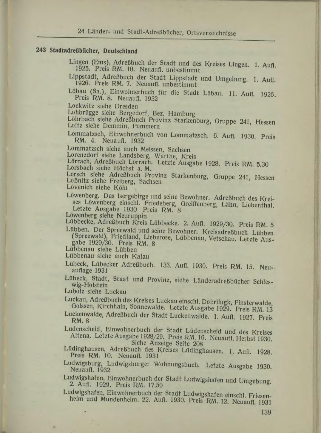Lippstadt, Adreßbuch der Stadt Lippstadt und Umgebung. 1. Aufl. 1926. Preis RM. 7. Neuaufl. unbestimmt Löbau (Sa.), Einwohnerbuch für die Stadt Löbau. 11. Aufl. 1926. Preis RM. 8. Neuaufl. 1932 Lockwitz siehe Dresden Lohbrügge siehe Bergedorf, Bez. Hamburg Löhrbach siehe Adreßbuch Provinz Starkenburg, Gruppe 241, Hessen Loitz siehe Demmin, Pommern Lommatzsch, Einwohnerbuch von Lommatzsch. 6. Aufl. 1930. Preis RM. 4. Neuaufl. 1932 Lommatzsch siehe auch Meissen, Sachsen Lorenzdorf siehe Landsberg, Warthe, Kreis Lörrach, Adreßbuch Lörrach. Letzte Ausgabe 1928. Preis RM. 5.30 Lorsbach siehe Höchst a. M. Lorsch siehe Adreßbuch Provinz Starkenburg, Gruppe 241, Hessen Loßnitz siehe Freiberg, Sachsen Lövenich siehe Köln Löwenberg. Das Isergebirge und seine Bewohner. Adreßbuch des Kreises Löwenberg einschl. Friedeberg, Greiffenberg, Lahn, Liebenthal. Letzte Ausgabe 1930 Preis RM. 8 Löwenberg siehe Neuruppin Lübbecke, Adreßbuch Kreis Lübbecke. 2. Aufl. 1929/30. Preis RM. 5 Lübben. Der Spreewald und seine Bewohner. Kreisadreßbuch Lübben (Spreewald), Friedland, Lieberose, Lübbenau, Vetschau. Letzte Ausgabe 1929/30. Preis RM. 8 Lübbenau siehe Lübben Lübbenau siehe auch Kalau Lübeck, Lübecker Adreßbuch. 133. Aufl. 1930. Preis RM. 15. Neuauflage 1931 Lübeck, Stadt, Staat und Provinz, siehe Länderadreßbücher Schleswig-Holstein Lubolz siehe Luckau Luckau, Adreßbuch des Kreises Luckau einschl. Dobrilugk, Finsterwalde, Golssen, Kirchhain, Sonnewalde. Letzte Ausgabe 1929. Preis RM. 13 Luckenwalde, Adreßbuch der Stadt Luckenwalde. 1. Aufl. 1927. Preis RM. 8 Lüdenscheid, Einwohnerbuch der Stadt Lüdenscheid und des Kreises Altena. Letzte Ausgabe 1928/29. Preis RM. 16. Neuaufl. Herbst 1930. Siehe Anzeige Seite 208 Lüdinghausen, Adreßbuch des Kreises Lüdinghausen. 1. Aufl. 1928. Preis RM. 10. Neuaufl. 1931 Ludwigsburg, Ludwigsburger Wohnungsbuch. Letzte Ausgabe 1930. Neuaufl. 1932 Ludwigshafen, Einwohnerbuch der Stadt Ludwigshafen und Umgebung. 2. Aufl. 1929. Preis RM. 17.50 Ludwigshafen, Einwohnerbuch der Stadt Ludwigshafen einschl. Friesenheim und Mundenheim. 22. Aufl. 1930. Preis RM. 12. Neuaufl. 1931 | |