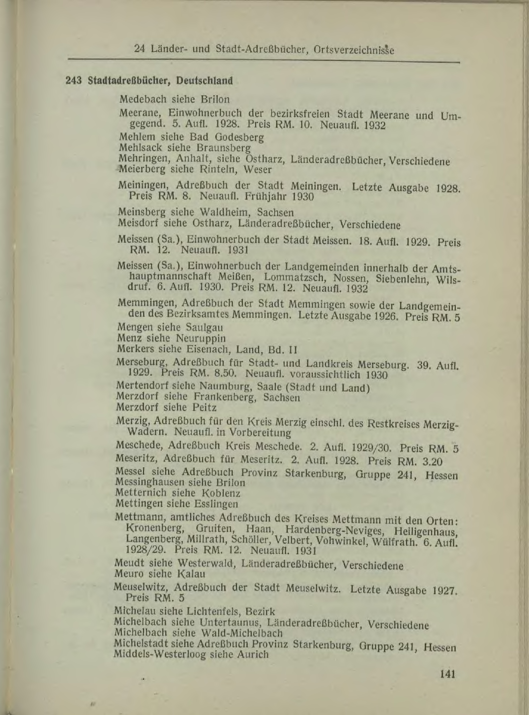 Meerane, Einwohnerbuch der bezirksfreien Stadt Meerane und Umgegend. 5. Aufl. 1928. Preis RM. 10. Neuaufl. 1932 Mehlem siehe Bad Godesberg Mehlsack siehe Braunsberg Mehringen, Anhalt, siehe Ostharz, Länderadreßbücher, Verschiedene Meierberg siehe Rinteln, Weser Meiningen, Adreßbuch der Stadt Meiningen. Letzte Ausgabe 1928. Preis RM. 8. Neuaufl. Frühjahr 1930 Meinsberg siehe Waldheim, Sachsen Meisdorf siehe Ostharz, Länderadreßbücher, Verschiedene Meissen (Sa.), Einwohnerbuch der Stadt Meissen. 18. Aufl. 1929. Preis RM. 12. Neuaufl. 1931 Meissen (Sa.), Einwohnerbuch der Landgemeinden innerhalb der Amtshauptmannschaft Meißen, Lommatzsch, Nossen, Siebenlehn, Wils-druf. 6. Aufl. 1930. Preis RM. 12. Neuaufl. 1932 Memmingen, Adreßbuch der Stadt Memmingen sowie der Landgemeinden des Bezirksamtes Memmingen. Letzte Ausgabe 1926. Preis RM. 5 Mengen siehe Saulgau Menz siehe Neuruppin Merkers siehe Eisenach, Land, Bd. II Merseburg, Adreßbuch für Stadt- und Landkreis Merseburg. 39. Aufl. 1929. Preis RM. 8.50. Neuaufl. voraussichtlich 1930 Mertendorf siehe Naumburg, Saale (Stadt und Land) Merzdorf siehe Frankenberg, Sachsen Merzdorf siehe Peitz Merzig, Adreßbuch für den Kreis Merzig einschl. des Restkreises Merzig-Wadern. Neuaufl. in Vorbereitung Meschede, Adreßbuch Kreis Meschede. 2. Aufl. 1929/30. Preis RM. 5 Meseritz, Adreßbuch für Meseritz. 2. Aufl. 1928. Preis RM. 3.20 Messel siehe Adreßbuch Provinz Starkenburg, Gruppe 241, Hessen Messinghausen siehe Brilon Metternich siehe Koblenz Mettingen siehe Esslingen Mettmann, amtliches Adreßbuch des Kreises Mettmann mit den Orten: Kronenberg, Gruiten, Haan, Hardenberg-Neviges, Heiligenhaus, Langenberg, Millrath, Schöller, Velbert, Vohwinkel, Wülfrath. 6. Aufl. 1928/29. Preis RM. 12. Neuaufl. 1931 Meudt siehe Westerwald, Länderadreßbücher, Verschiedene Meuro siehe Kalau Meuselwitz, Adreßbuch der Stadt Meuselwitz. Letzte Ausgabe 1927. Preis RM. 5 Michelau siehe Lichtenfels, Bezirk Michelbach siehe Untertaunus, Länderadreßbücher, Verschiedene Michelbach siehe Wald-Michelbach Michelstadt siehe Adreßbuch Provinz Starkenburg, Gruppe 241, Hessen Middels-Westerloog siehe Aurich | |