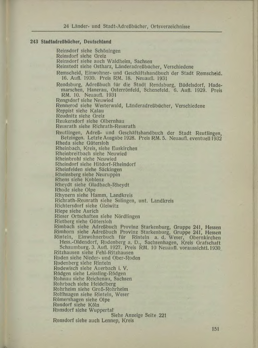 Reinsdorf siehe Greiz Reinsdorf siehe auch Waldheim, Sachsen Reinstedt siehe Ostharz, Länderadreßbücher, Verschiedene Remscheid, Einwohner- und Geschäftshandbuch der Stadt Remscheid. 16. Aufl. 1930. Preis RM. 18. Neuaufl. 1931 Rendsburg, Adreßbuch für die Stadt Rendsburg, Büdelsdorf, Hade-marschen, Hanerau, Osterrönfeld, Schenefeld. 6. Aufl. 1929. Preis RM. 10. Neuaufl. 1931 Rengsdorf siehe Neuwied Rennerod siehe Westerwald, Länderadreßbücher, Verschiedene Reppist siehe Kalau Reudnitz siehe Greiz Reukersdorf siehe Olbernhau Reusrath siehe Richrath-Reusrath Reutlingen, Adreß- und Geschäftshandbuch der Stadt Reutlingen, Betzingen. Letzte Ausgabe 1928. Preis RM. 5. Neuaufl. eventuell 1932 Rheda siehe Gütersloh Rheinbach, Kreis, siehe Euskirchen Rheinbreitbach siehe Neuwied Rheinbrohl siehe Neuwied Rheindorf siehe Hitdorf-Rheindorf Rheinfelden siehe Säckingen Rheinsberg siehe Neuruppin Rhens siehe Koblenz Rheydt siehe Gladbach-Rheydt Rhode siehe Olpe Rhynern siehe Hamm, Landkreis Richrath-Reusrath siehe Solingen, unt. Landkreis Richtersdorf siehe Gleiwitz Riepe siehe Aurich Rieser Ortschaften siehe Nördlingen Rietberg siehe Gütersloh Rimbach siehe Adreßbuch Provinz Starkenburg, Gruppe 241, Hessen Rimhorn siehe Adreßbuch Provinz Starkenburg, Gruppe 241, Hessen Rinteln, Einwohnerbuch für Rinteln a. d. Weser, Obernkirchen Hess.-Oldendorf, Rodcnberg a. D., Sachsenhagen, Kreis Grafschaft Schaumburg. 3. Aufl. 1927. Preis RM. 10 Neuaufl. voraussieht!. 1930 Ritzhausen siehe Fehl-Ritzhausen Roden siehe Nieder- und Ober-Roden Rodenberg siehe Rinteln Rodewisch siehe Auerbach i. V. Rödgen siehe Leissling-Rödgen Rohnau siehe Reichenau, Sachsen Rohrbach siehe Heidelberg Rohrheim siehe Groß-Rohrheim Rolfhsagen siehe Rinteln, Weser Römershagen siehe Olpe Rondorf siehe Köln Ronsdorf siehe Wuppertal Siehe Anzeige Seite 221 Ronsdorf siehe auch Lennep, Kreis | |