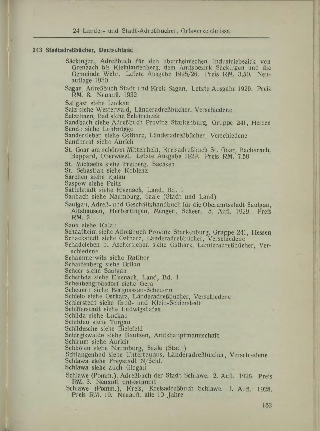 Sagan, Adreßbuch Stadt und Kreis Sagan. Letzte Ausgabe 1929. Preis RM. 8. Neuaufl. 1932 Sallgast siehe Luckau Salz siehe Westerwald, Länderadreßbücher, Verschiedene Salzelinen, Bad siehe Schönebeck Sandbach siehe Adreßbuch Provinz Starkenburg, Gruppe 241, Hessen Sande siehe Lohbrügge Sandersleben siehe Ostharz, Länderadreßbücher, Verschiedene Sandhorst siehe Aurich St. Goar am schönen Mittelrhein, Kreisadreßbuch St. Goar, Bacharach, Boppard, Oberwesel. Letzte Ausgabe 1929. Preis RM. 7.50 St. Michaelis siehe Freiberg, Sachsen St. Sebastian siehe Koblenz Särchen siehe Kalau Saspow siehe Peitz Sättelstädt siehe Eisenach, Land, Bd. I Saubach siehe Naumburg, Saale (Stadt und Land) Saulgau, Adreß- und Geschäftshandbuch für die Oberamtsstadt Saulgau, Altshausen, Herbertingen, Mengen, Scheer. 5. Aufl. 1929. Preis RM. 2 Sauo siehe Kalau Schaafheim siehe Adreßbuch Provinz Starkenburg, Gruppe 241, Hessen Schackstedt siehe Ostharz, Länderadreßbücher, Verschiedene Schadeleben b. Aschersleben siehe Ostharz, Länderadreßbücher, Verschiedene Schammerwitz siehe Ratibor Scharfenberg siehe Brilon Scheer siehe Saulgau Scherbda siehe Eisenach, Land, Bd. I Scheubengrobsdorf siehe Gera Scheuern siehe Bergnassau-Scheuern Schieb siehe Ostharz, Länderadreßbücher, Verschiedene Schierstedt siehe Groß- und Klein-Schierstedt Schifferstadt siehe Ludwigshafen Schilda siehe Luckau Schildau siehe Torgau Schildesche siehe Bielefeld Schirgiswalde siehe Bautzen, Amtshauptmannschaft Schirum siehe Aurich Schkölen siehe Naumburg, Saale (Stadt) Schlangenbad siehe Untertaunus, Länderadreßbücher, Verschiedene Schlawa siehe Freystadt N/Schi. Schlawa siehe auch Glogau Schlawe (Pomm.), Adreßbuch der Stadt Schlawe. 2. Aufl. 1920. Preis RM. 3. Neuaufl. unbestimmt Schlawe (Pomm.), Kreis, Kreisadreßbuch Schlawe. 1. Aufl. 1928. Preis RM. 10. Neuaufl. alle 10 Jahre | |