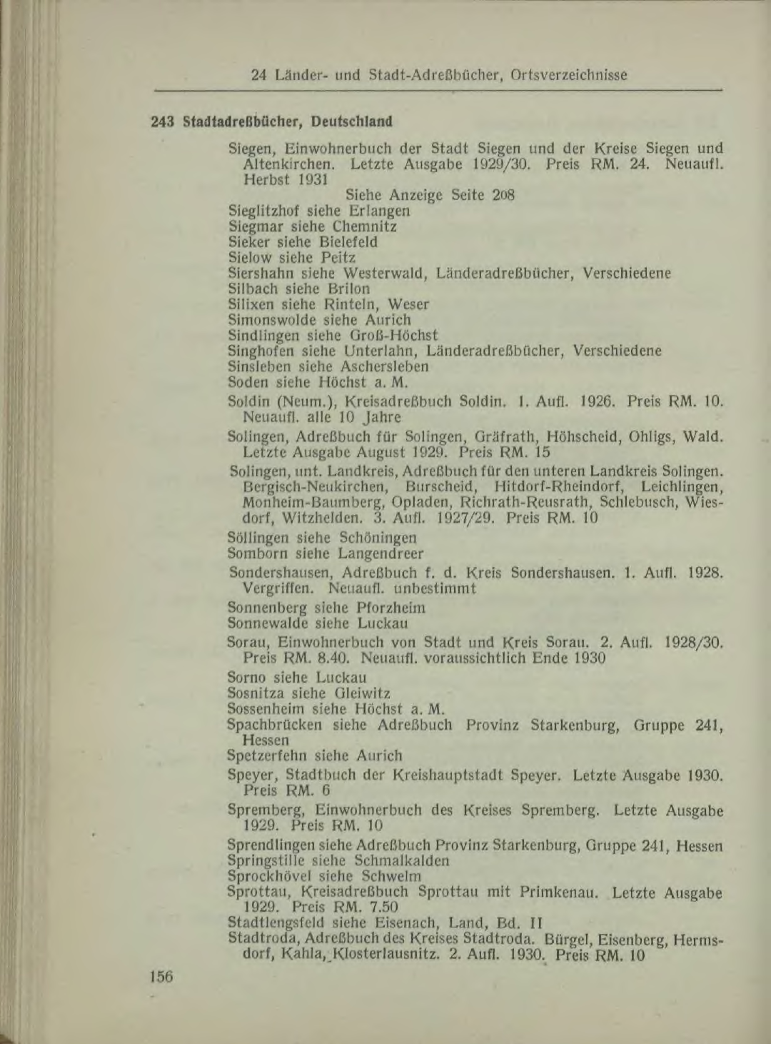 Siegen, Einwohnerbuch der Stadt Siegen und der Kreise Siegen und Altenkirchen. Letzte Ausgabe 1929/30. Preis RM. 24. Neuaufl. Herbst 1931 Siehe Anzeige Seite 208 Sieglitzhof siehe Erlangen Siegmar siehe Chemnitz Sieker siehe Bielefeld Sielow siehe Peitz Siershahn siehe Westerwald, Länderadreßbücher, Verschiedene Silbach siehe Brilon Silixen siehe Rinteln, Weser Simonswolde siehe Aurich Sindlingen siehe Groß-Höchst Singhofen siehe Unterlahn, Länderadreßbücher, Verschiedene Sinsleben siehe Aschersleben Soden siehe Höchst a. M. Soldin (Neum.), Kreisadreßbuch Soldin. 1. Aufl. 1926. Preis RM. 10. Neuaufl. alle 10 Jahre Solingen, Adreßbuch für Solingen, Gräfrath, Höhscheid, Ohligs, Wald. Letzte Ausgabe August 1929. Preis RM. 15 Solingen, unt. Landkreis, Adreßbuch für den unteren Landkreis Solingen. Bergisch-Neukirchen, Burscheid, Hitdorf-Rheindorf, Leichlingen, Monheim-Baumberg, Opladen, Richrath-Reusrath, Schlebusch, Wiesdorf, Witzhelden. 3. Aufl. 1927/29. Preis RM. 10 Söllingen siehe Schöningen Somborn siehe Langendreer Sondershausen, Adreßbuch f. d. Kreis Sondershausen. 1. Aufl. 1928. Vergriffen. Neuaufl. unbestimmt Sonnenberg siehe Pforzheim Sonnewalde siehe Luckau Sorau, Einwohnerbuch von Stadt und Kreis Sorau. 2. Aufl. 1928/30. Preis RM. 8.40. Neuaufl. voraussichtlich Ende 1930 Sorno siehe Luckau Sosnitza siehe Gleiwitz Sossenheim siehe Höchst a. M. Spachbrücken siehe Adreßbuch Provinz Starkenburg, Gruppe 241, Hessen Spetzerfehn siehe Aurich Speyer, Stadtbuch der Kreishauptstadt Speyer. Letzte Ausgabe 1930. Preis RM. 6 Spremberg, Einwohnerbuch des Kreises Spremberg. Letzte Ausgabe 1929. Preis RM. 10 Sprendlingen siehe Adreßbuch Provinz Starkenburg, Gruppe 241, Hessen Springstille siehe Schmalkalden Sprockhövel siehe Schwelm Sprottau, Kreisadreßbuch Sprottau mit Primkenau. Letzte Ausgabe 1929. Preis RM. 7.50 Stadtlengsfeld siehe Eisenach, Land, Bd. II Stadtroda, Adreßbuch des Kreises Stadtroda. Bürgel, Eisenberg, Hermsdorf, Kahla, Klosterlausnitz. 2. Aufl. 1930. Preis RM. 10 | |