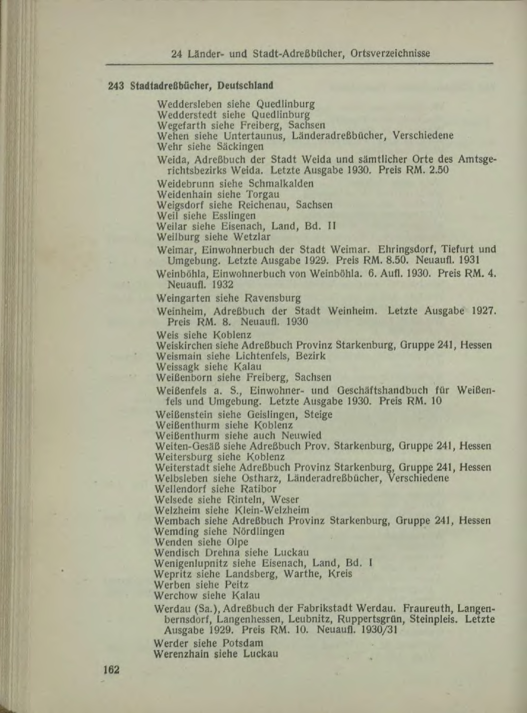Wedderstedt siehe Quedlinburg Wegefarth siehe Freiberg, Sachsen Wehen siehe Untertaunus, Länderadreßbücher, Verschiedene Wehr siehe Säckingen Weida, Adreßbuch der Stadt Weida und sämtlicher Orte des Amtsgerichtsbezirks Weida. Letzte Ausgabe 1930. Preis RM. 2.50 Weidebrunn siehe Schmalkalden Weidenhain siehe Torgau Weigsdorf siehe Reichenau, Sachsen Weil siehe Esslingen Weilar siehe Eisenach, Land, Bd. II Weilburg siehe Wetzlar Weimar, Einwohnerbuch der Stadt Weimar. Ehringsdorf, Tiefurt und Umgebung. Letzte Ausgabe 1929. Preis RM. 8.50. Neuaufl. 1931 Weinböhla, Einwohnerbuch von Weinböhla. 6. Aufl. 1930. Preis RM. 4. Neuaufl. 1932 Weingarten siehe Ravensburg Weinheim, Adreßbuch der Stadt Weinheim. Letzte Ausgabe 1927. Preis RM. 8. Neuaufl. 1930 Weis siehe Koblenz Weiskirchen siehe Adreßbuch Provinz Starkenburg, Gruppe 241, Hessen Weismain siehe Lichtenfels, Bezirk Weissagk siehe Kalau Weißenborn siehe Freiberg, Sachsen Weißenfels a. S., Einwohner- und Oeschäftshandbuch für Weißenfels und Umgebung. Letzte Ausgabe 1930. Preis RM. 10 Weißenstein siehe Geislingen, Steige Weißenthurm siehe Koblenz Weißenthurm siehe auch Neuwied Weiten-Gesäß siehe Adreßbuch Prov. Starkenburg, Gruppe 241, Hessen Weitersburg siehe Koblenz Weiterstadt siehe Adreßbuch Provinz Starkenburg, Gruppe 241, Hessen Welbsleben siehe Ostharz, Länderadreßbücher, Verschiedene Wellendorf siehe Ratibor Welsede siehe Rinteln, Weser Welzheim siehe Klein-Welzheim Wembach siehe Adreßbuch Provinz Starkenburg, Gruppe 241, Hessen Wemding siehe Nördlingen Wenden siehe Olpe Wendisch Drehna siehe Luckau Wenigenlupnitz siehe Eisenach, Land, Bd. I Wepritz siehe Landsberg, Warthe, Kreis Werben siehe Peitz Werchow siehe Kalau Werdau (Sa.), Adreßbuch der Fabrikstadt Werdau. Fraureuth, Langen-bernsdorf, Langenhessen, Leubnitz, Ruppertsgrün, Steinpleis. Letzte Ausgabe 1929. Preis RM. 10. Neuaufl. 1930/31 Werder siehe Potsdam Werenzhain siehe Luckau | |
