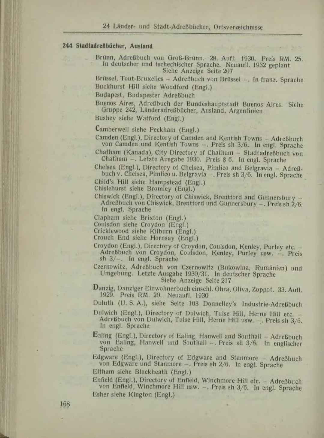 Brüssel, Tout-Bruxelles - Adreßbuch von Brüssel -. In franz. Sprache Buckhurst Hill siehe Woodford (Engl.) Budapest, Budapester Adreßbuch Buenos Aires, Adreßbuch der Bundeshauptstadt Buenos Aires. Siehe Gruppe 242, Länderadreßbücher, Ausland, Argentinien Bushey siehe Watford (Engl.) Camberwell siehe Peckham (Engl.) Camden (Engl.), Directory of Camden and Kentish Towns - Adreßbuch von Camden und Kentish Towns -. Preis sh 3/6. In engl. Sprache Chatham (Kanada), City Directory of Chatham Stadtadreßbuch von Chatham -. Letzte Ausgabe 1930. Preis $ 6. In engl. Sprache Chelsea (Engl.), Directory of Chelsea, Pimlico and Belgravia - Adreßbuch v. Chelsea, Pimlico u. Belgravia -. Preis sh 3/6. In engl. Sprache Child's Hill siehe Hampstead (Engl.) Chislehurst siehe Bromley (Engl.) Chiswick (Engl.), Directory of Chiswick, Brentford and Gunnersbury - Adreßbuch von Chiswick, Brentford und Gunnersbury -. Preis sh 2/6. In engl. Sprache Clapham siehe Brixton (Engl.) Coulsdon siehe Croydon (Engl.) Cricklewood siehe Kilburn (Engl.) Crouch End siehe Hornsay (Engl.) Croydon (Engl.), Directory of Croydon, Coulsdon, Kenley, Purley etc. - Adreßbuch von Croydon, Coulsdon, Kenley, Purley usw. -. Preis sh 3/--. In engl. Sprache Czernowitz, Adreßbuch von Czernowitz (Bukowina, Rumänien) und Umgebung. Letzte Ausgabe 1930/31. In deutscher Sprache Siehe Anzeige Seite 217