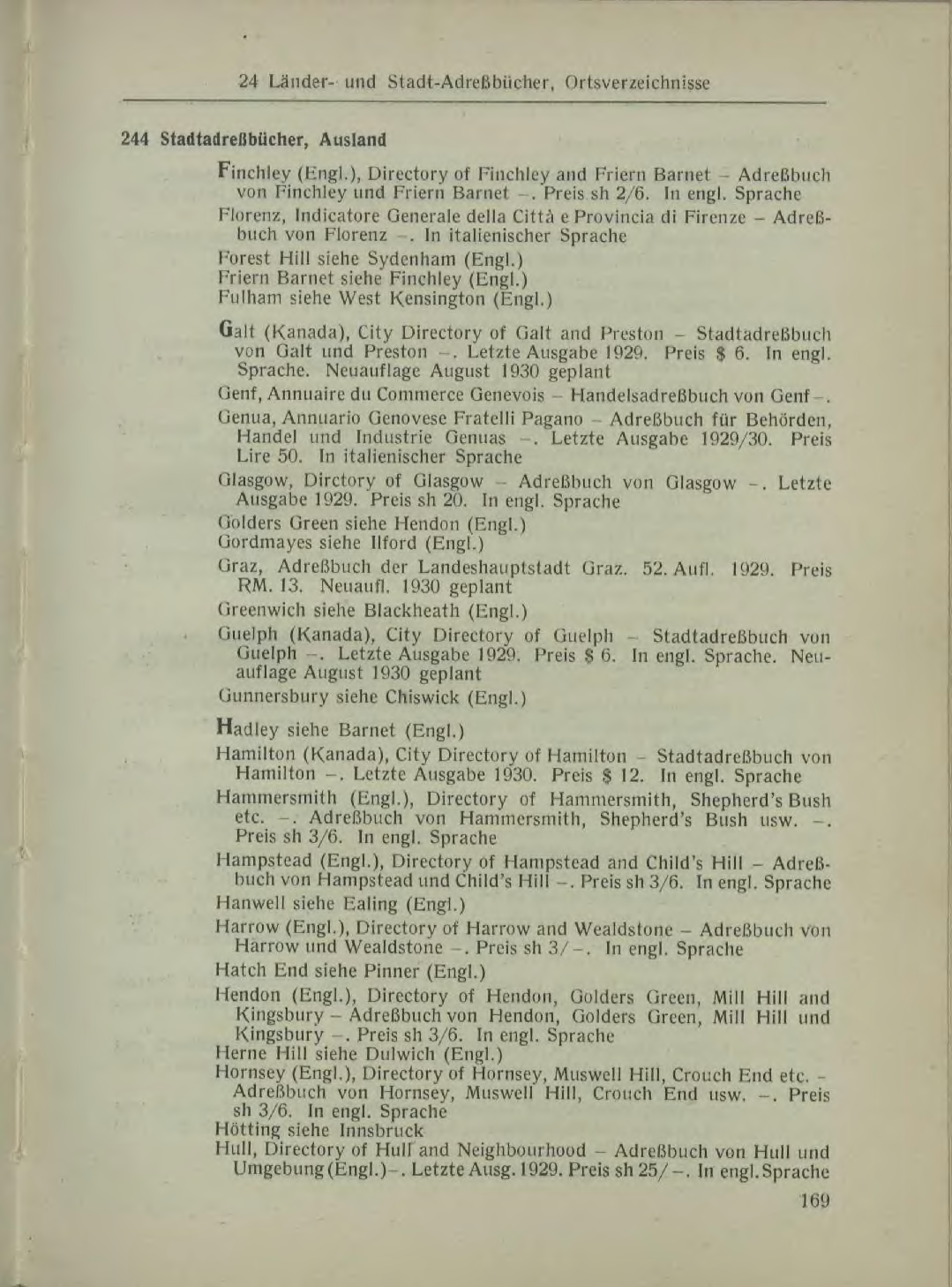 Genf, Annuaire du Commerce Genevois - Handelsadreßbuch von Genf Genua, Annuario Genovese Fratelli Pagano - Adreßbuch für Behörden, Handel und Industrie Genuas. Letzte Ausgabe 1929/30. Preis Lire 50. In italienischer Sprache Glasgow, Dirctory of Glasgow - Adreßbuch von Glasgow -. Letzte Ausgabe 1929. Preis sh 20. In engl. Sprache Golders Green siehe Hendon (Engl.) Gordmayes siehe Ilford (Engl.) Graz, Adreßbuch der Landeshauptstadt Graz. 52. Aufl. 1929. Preis RM. 13. Neuaufl. 1930 geplant Greenwich siehe Blackheath (Engl.) Guelph (Kanada), City Directory of üuelph - Stadtadreßbuch von Guelph -. Letzte Ausgabe 1929. Preis $ 6. In engl. Sprache. Neuauflage August 1930 geplant Gunnersbury siehe Chiswick (Engl.)