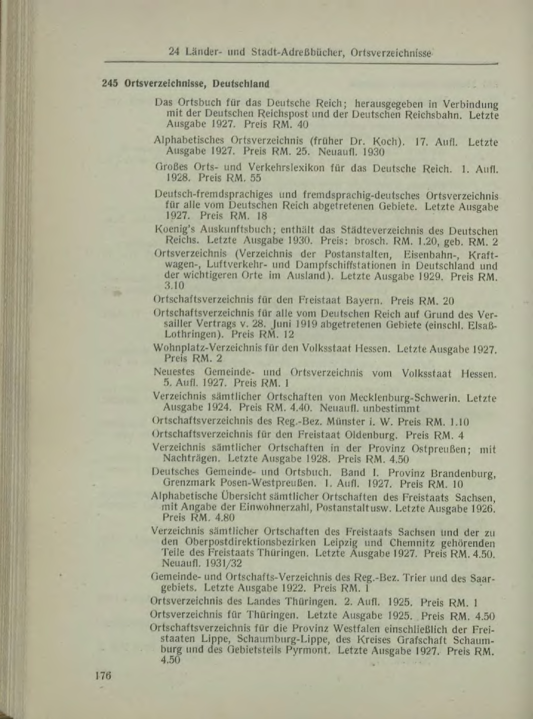Alphabetisches Ortsverzeichnis (früher Dr. Koch). 17. Aufl. Letzte Ausgabe 1927. Preis RM. 25. Neuaufl. 1930 Großes Orts- und Verkehrslexikon für das Deutsche Reich. 1. Aufl. 1928. Preis RM. 55 Deutsch-fremdsprachiges und fremdsprachig-deutsches Ortsverzeichnis für alle vom Deutschen Reich abgetretenen Gebiete. Letzte Ausgabe 1927. Preis RM. 18 Koenig's Auskunftsbuch; enthalt das Städteverzeichnis des Deutschen Reichs. Letzte Ausgabe 1930. Preis: brosch. RM. 1.20, geb. RM. 2 Ortsverzeichnis (Verzeichnis der Postanstalten, Eisenbahn-, Kraftwagen-, Luftverkehr- und Dampfschiffstationen in Deutschland und der wichtigeren Orte im Ausland). Letzte Ausgabe 1929. Preis RM. 3.10 Ortschaftsverzeichnis für den Freistaat Bayern. Preis RM. 20 Ortschaftsverzeichnis für alle vom Deutschen Reich auf Grund des Ver-sailler Vertrags v. 28. Juni 1919 abgetretenen Gebiete (einschl. ElsalJ-Lothringen). Preis RM. 12 Wohnplatz-Verzeichnis für den Volksstaat Hessen. Letzte Ausgabe 1927. Preis RM. 2 Neuestes Gemeinde- und Ortsverzeichnis vom Volksstaat Hessen. 5. Aufl. 1927. Preis RM. 1 Verzeichnis sämtlicher Ortschaften von Mecklenburg-Schwerin. Letzte Ausgabe 1924. Preis RM. 4.40. Neuaufl. unbestimmt Ortschaftsverzeichnis des Reg.-Bez. Münster i. W. Preis RM. 1.10 Ortschaftsverzeichnis für den Freistaat Oldenburg. Preis RM. 4 Verzeichnis sämtlicher Ortschaften in der Provinz Ostpreußen; mit Nachtrügen. Letzte Ausgabe 1928. Preis RM. 4.50 Deutsches Gemeinde- und Ortsbuch. Band I. Provinz Brandenburg, Grenzmark Posen-Westpreußen. 1. Aufl. 1927. Preis RM. 10 Alphabetische Übersicht sämtlicher Ortschaften des Freistaats Sachsen, mit Angabe der Einwohnerzahl, Postanstaltusw. Letzte Ausgabe 1926. Preis RM. 4.80 Verzeichnis sämtlicher Ortschaften des Freistaats Sachsen und der zu den Oberpostdirektionsbezirken Leipzig und Chemnitz gehörenden Teile des Freistaats Thüringen. Letzte Ausgabe 1927. Preis RM. 4.50. Neuaufl. 1931/32 Gemeinde- und Ortschafts-Verzeichnis des Reg.-Bez. Trier und des Saargebiets. Letzte Ausgabe 1922. Preis RM. 1 Ortsverzeichnis des Landes Thüringen. 2. Aufl. 1925. Preis RM. 1 Ortsverzeichnis für Thüringen. Letzte Ausgabe 1925. Preis RM. 4.50 Ortschaftsverzeichnis für die Provinz Westfalen einschließlich der Freistaaten Lippe, Schaumburg-Lippe, des Kreises Grafschaft Schaumburg und des Gebietsteils Pyrmont. Letzte Ausgabe 1927. Preis RM. 4.50 | |