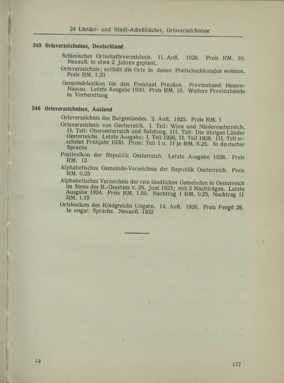 Ortsverzeichnis von Oesterreich. I. Teil: Wien und Niederoesterreich. II. Teil: Oberoesterreich und Salzburg. III. Teil: Die übrigen Länder Oesterreichs. Letzte Ausgabe: I. Teil 1926, II. Teil 1928. III. Teil erscheint Frühjahr 1930. Preis: Teil I u. II je RM. 6.25. In deutscher Sprache Postlexikon der Republik Oesterreich. Letzte Ausgabe 1928. Preis RM. 12 Alphabetisches Gemeinde-Verzeichnis der Republik Oesterreich. Preis RM. 0.25 Alphabetisches Verzeichnis der rein ländlichen Gemeinden in Oesterreich im Sinne des B.-Gesetzes v. 28. Juni 1923; mit 2 Nachträgen. Letzte Ausgabe 1924. Preis RM. 1.50. Nachtrag I RM. 0.25, Nachtrag II RM. 1.15 Ortslexikon des Königreichs Ungarn. 14. Aufl. 1926. Preis Pengö 28. In ungar. Sprache. Neuaufl. 1932 | |