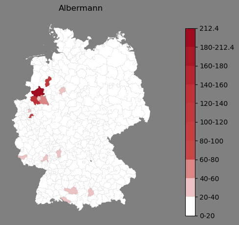 Relative Verteilung des Namens Albermann (1996)Direkt zur Karte Die Farbskala zeigt die Anzahl von "Albermann" bezogen auf je 1 Million Einträge. |