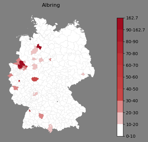 Relative Verteilung des Namens Albring (1996)Direkt zur Karte Die Farbskala zeigt die Anzahl von "Albring" bezogen auf je 1 Million Einträge. |