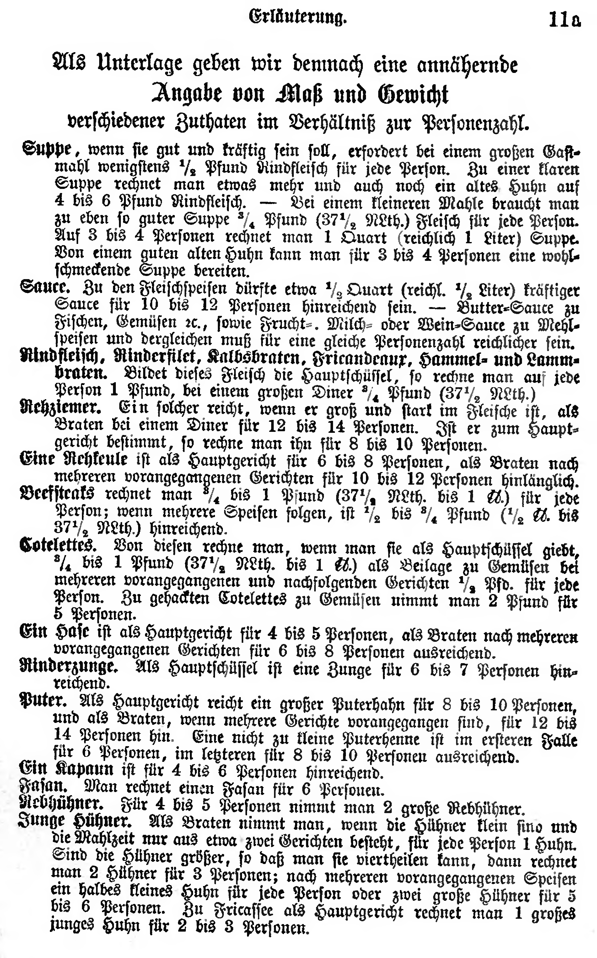 Als Unterlage geben wir demnach eine annähernde Angabe von Maß und Gewicht verschiedener Zuthaten im Verhältnis zur Personenzahl.