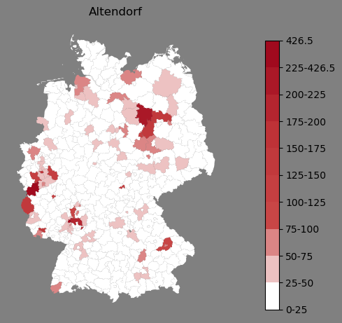 Absolute Verteilung des Namens Altendorf (1890)Direkt zur Karte Absolute Verteilung des Namens "Altendorf" um 1890 im damaligen Deutschen Reich Sie können die Karte innerhalb des Fensters zoomen und verschieben. |