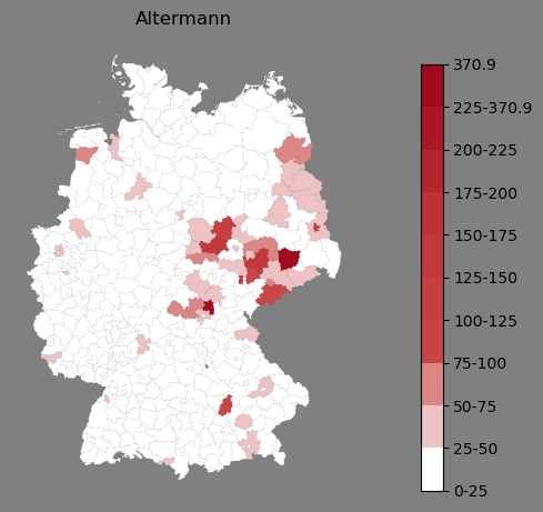 Absolute Verteilung des Namens Altermann (1890)Direkt zur Karte Absolute Verteilung des Namens "Altermann" um 1890 im damaligen Deutschen Reich Sie können die Karte innerhalb des Fensters zoomen und verschieben. |