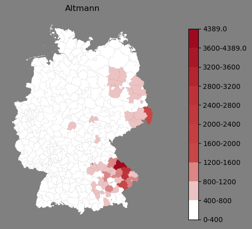 Relative Verteilung des Namens Altmann (1996)Direkt zur Karte Die Farbskala zeigt die Anzahl von "Altmann" bezogen auf je 1 Million Einträge. |